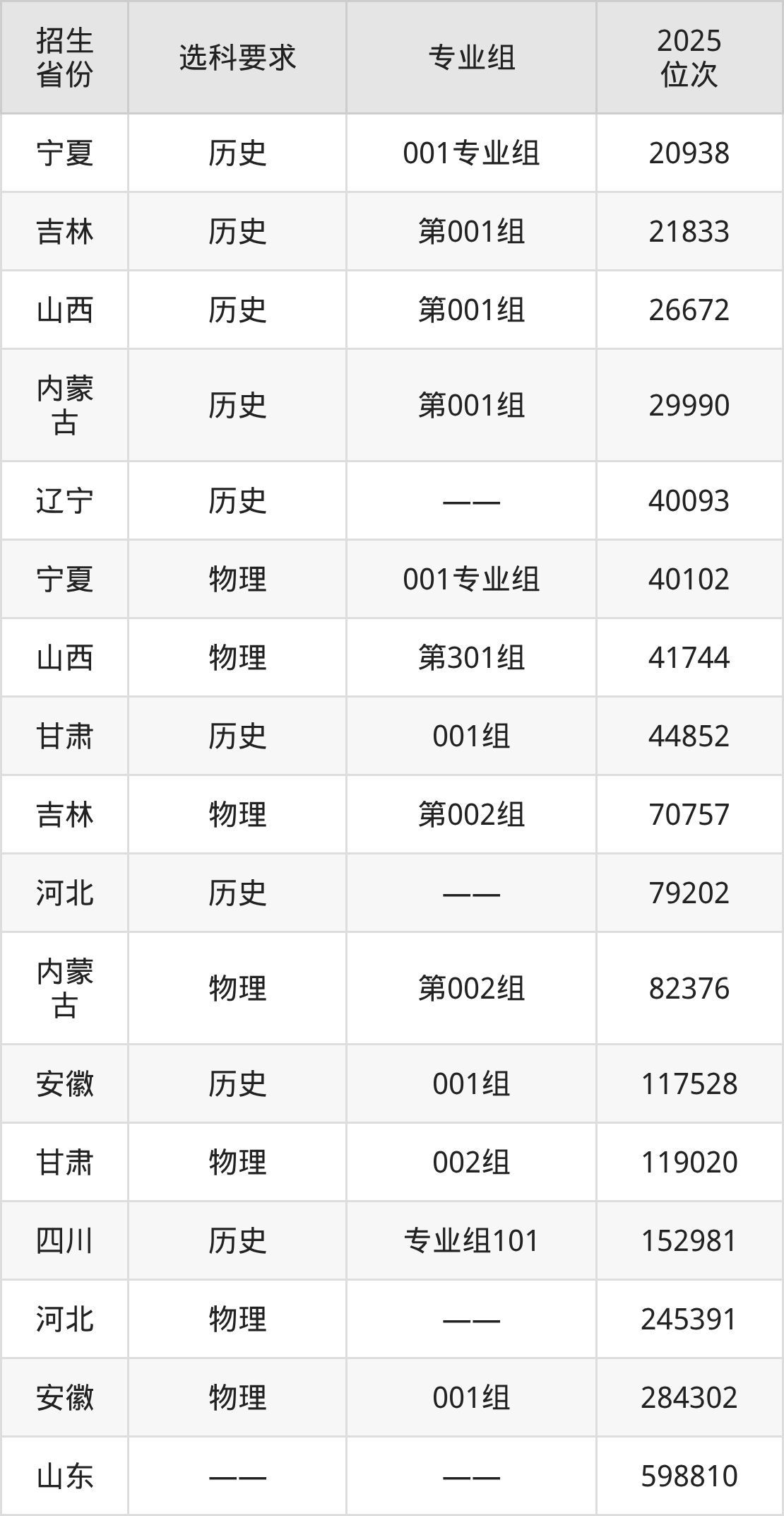 淄博師范高等??茖W(xué)校2025年在全國各省的位次差異較大,最高位次是20938位(寧夏歷史類)、最低位次是598810位(山東)。各省具體位次請看下圖: