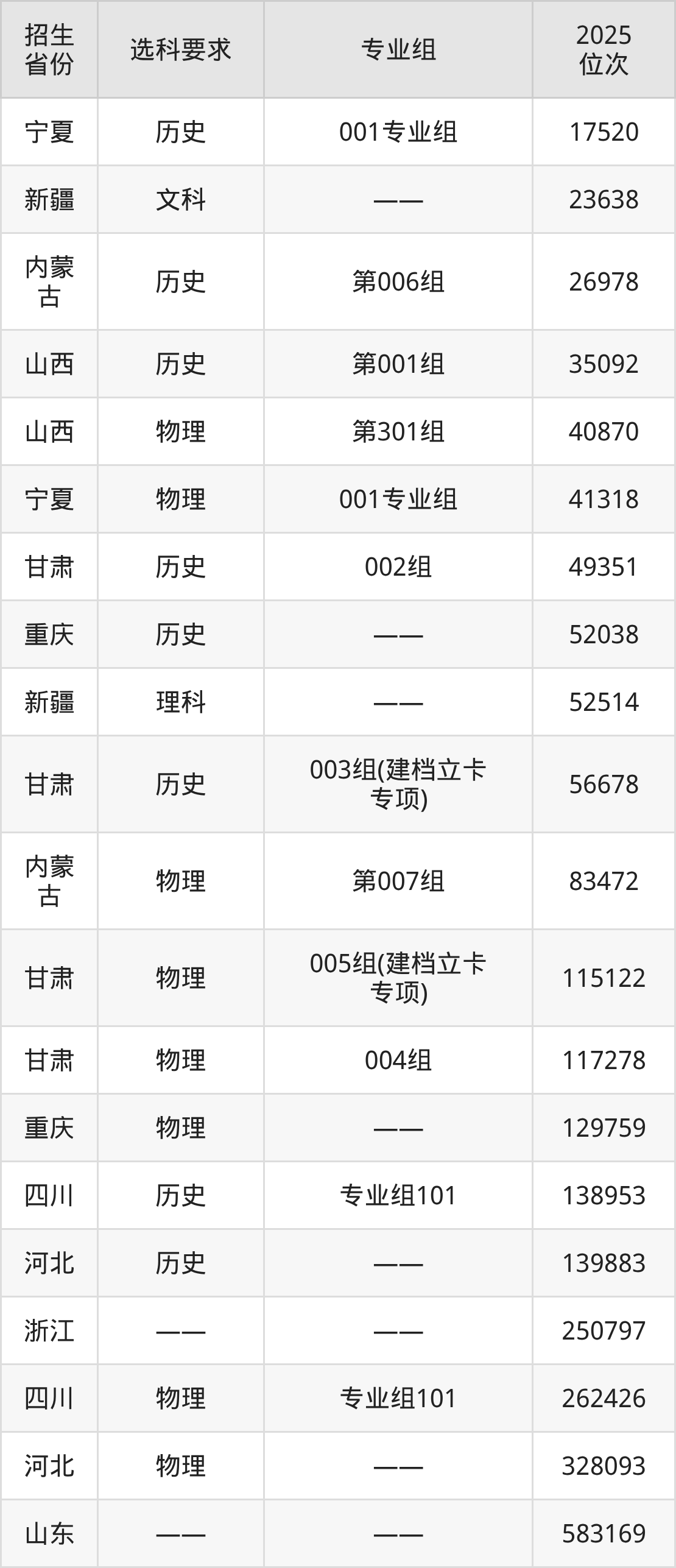 甘肅建筑職業(yè)技術(shù)學(xué)院2025年在全國(guó)各省的位次差異較大,最高位次是17520位(寧夏歷史類)、最低位次是583169位(山東)。各省具體位次請(qǐng)看下圖: