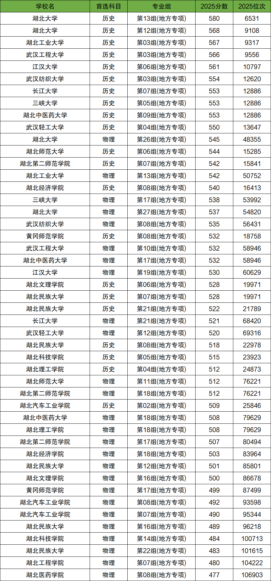 2025年湖北地方專項計劃的分?jǐn)?shù)線為:477分-580分,其中,歷史類509分-580分、物理類477分-545分。