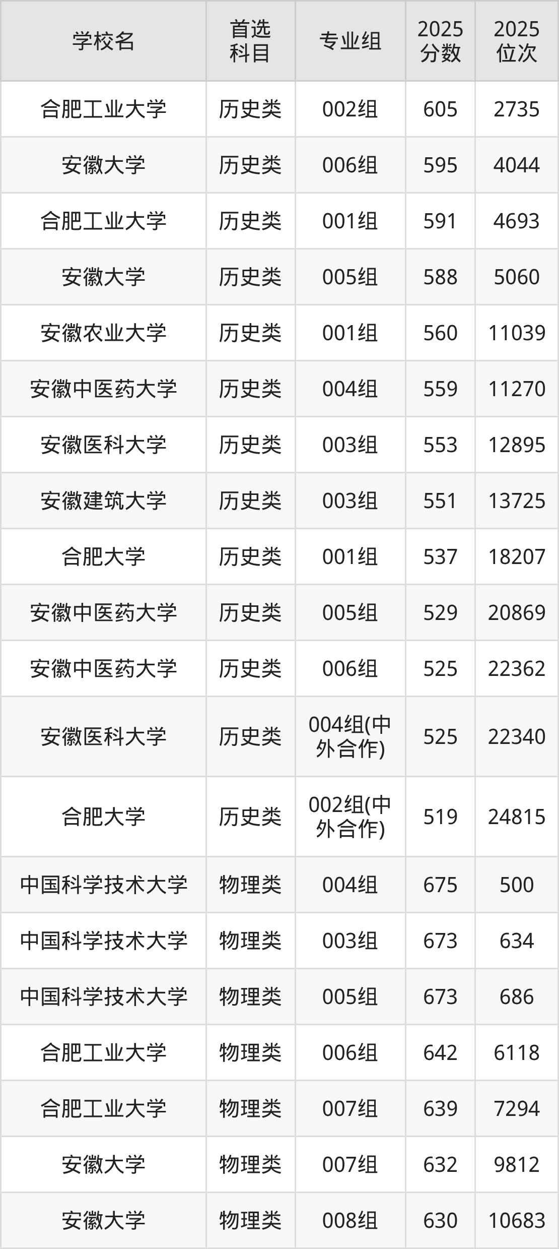 2025年一共有7所一本大學(xué)在合肥歷史類招生,包含了13個專業(yè)組,錄取分?jǐn)?shù)線從519分到605分不等,對應(yīng)最低位次從24815名到2735名。下面分別展示合肥市分?jǐn)?shù)線最高、最低的五個院校專業(yè)組。