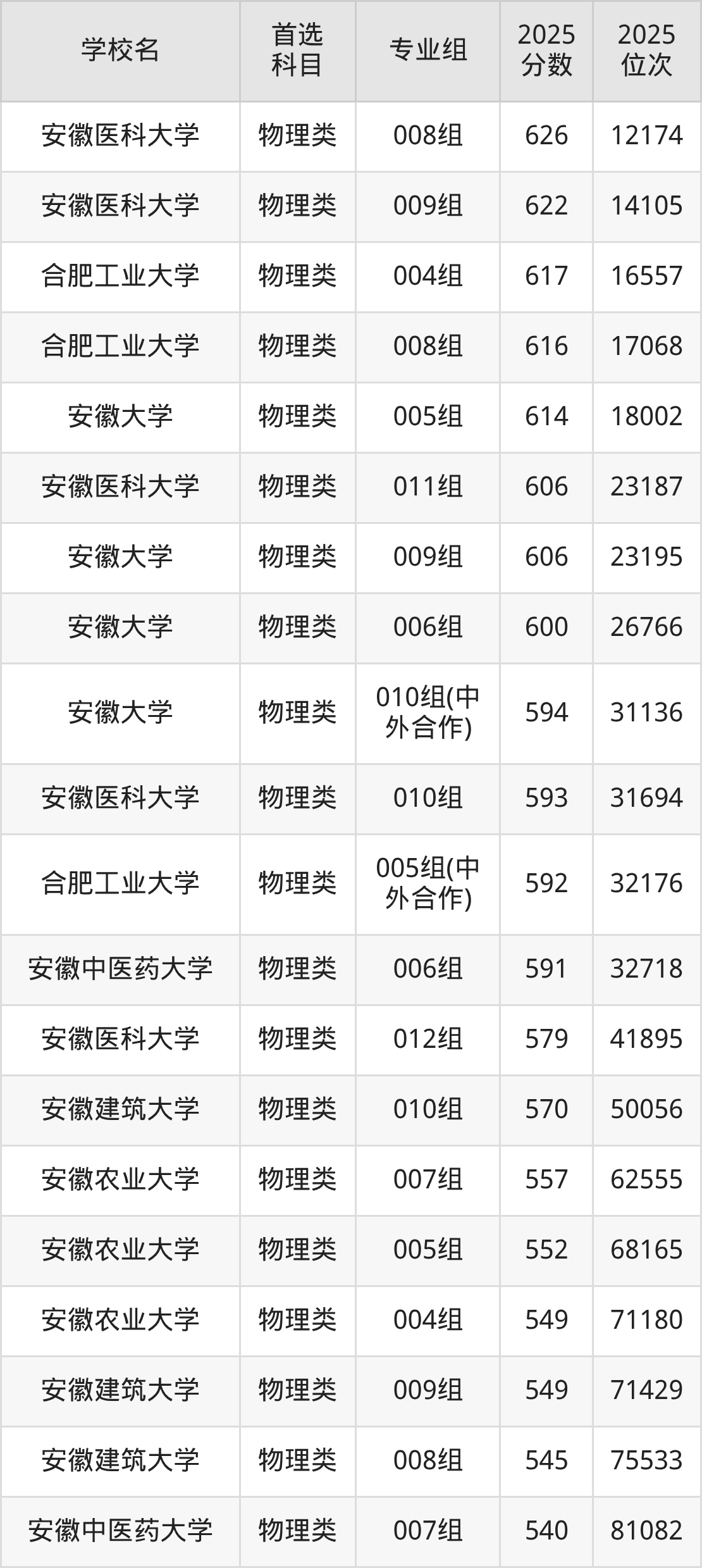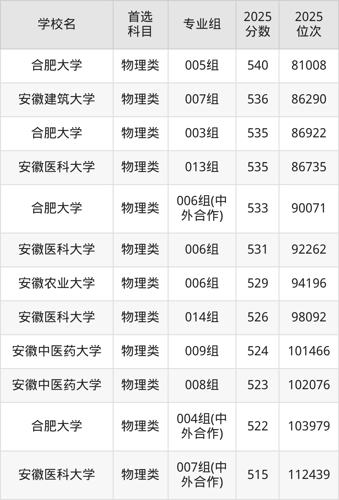 2025年一共有8所一本大學(xué)在合肥物理類招生,包含了39個專業(yè)組,錄取分?jǐn)?shù)線從515分到675分不等,對應(yīng)最低位次從112439名到500名。下面分別展示合肥市分?jǐn)?shù)線最高、最低的五個院校專業(yè)組。