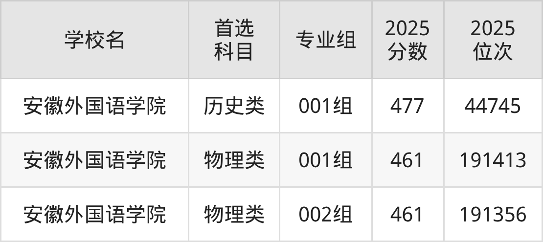 (2)安徽外國語學(xué)院002組:461分、191356名;