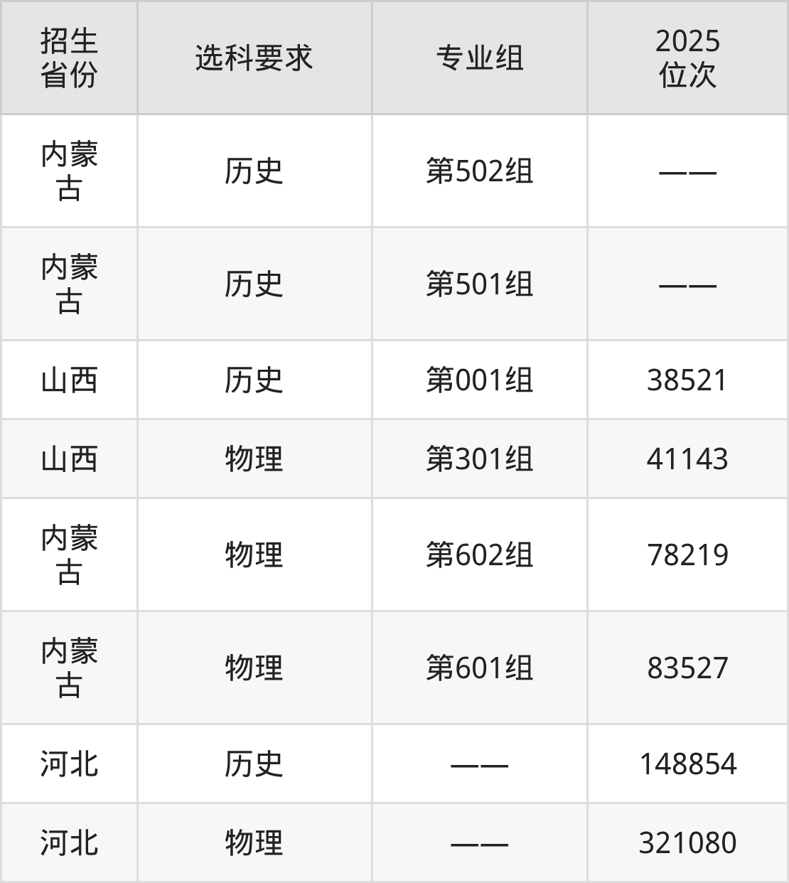 內(nèi)蒙古能源職業(yè)學(xué)院2025年在全國(guó)各省的位次差異較大,最高位次是38521位(山西歷史類)、最低位次是321080位(河北物理類)。各省具體位次請(qǐng)看下圖: