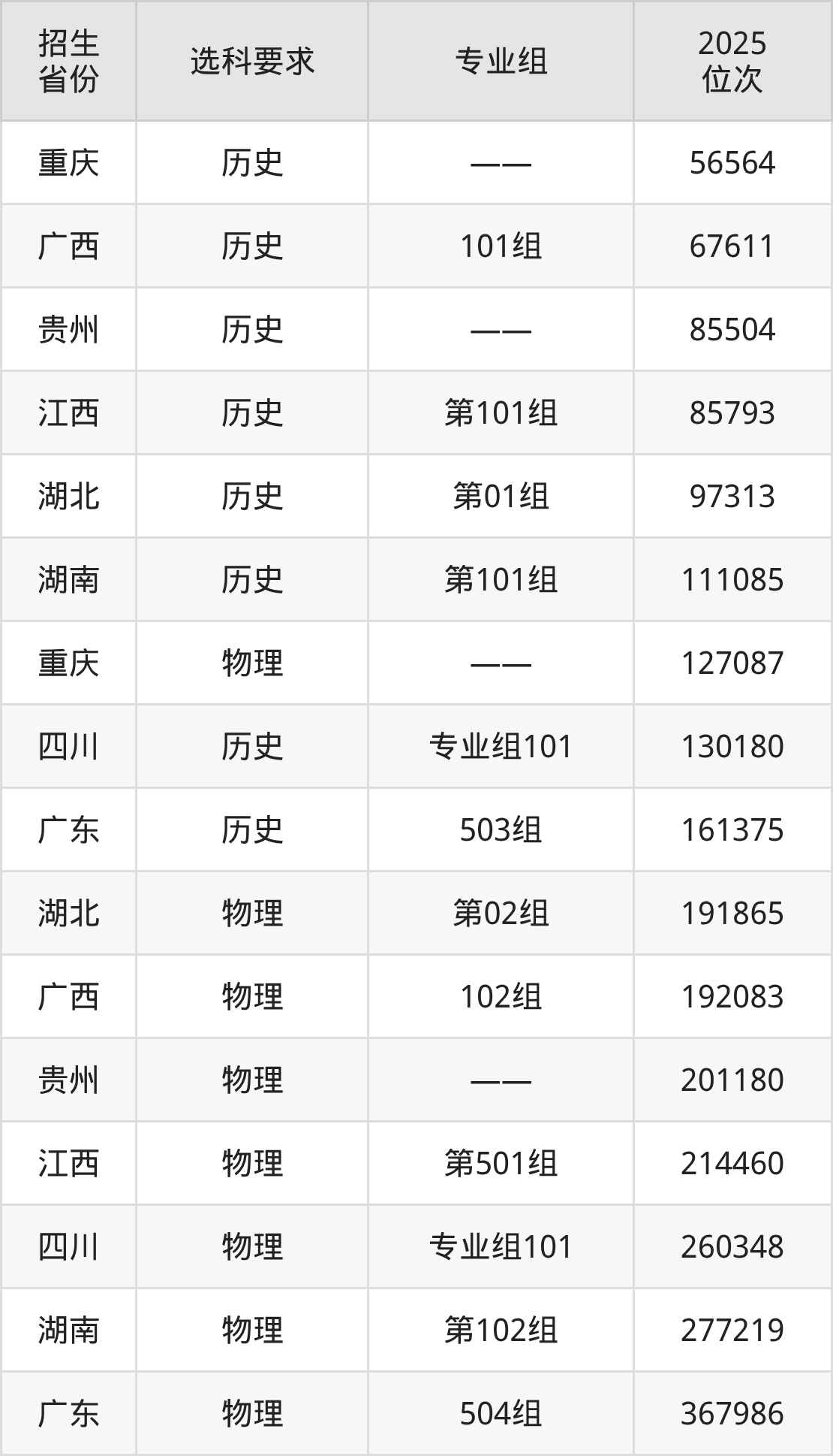 湘西民族職業(yè)技術(shù)學(xué)院2025年在全國各省的位次差異較大,最高位次是56564位(重慶歷史類)、最低位次是367986位(廣東物理類)。各省具體位次請看下圖: