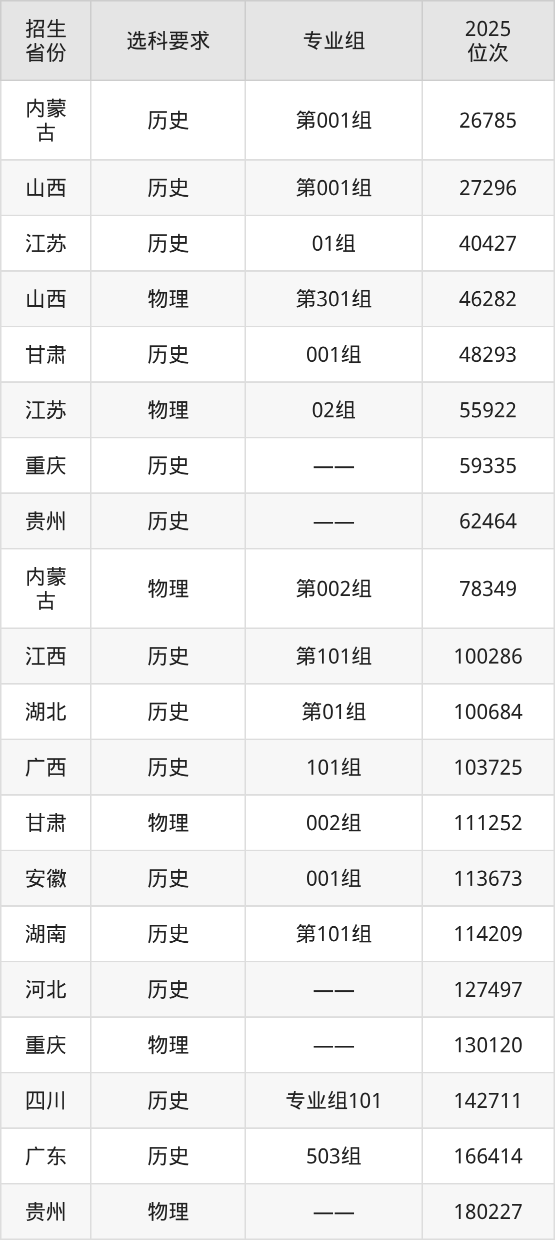 河南地礦職業(yè)學(xué)院2025年在全國各省的位次差異較大,最高位次是26785位(內(nèi)蒙古歷史類)、最低位次是477767位(山東)。各省具體位次請看下圖: