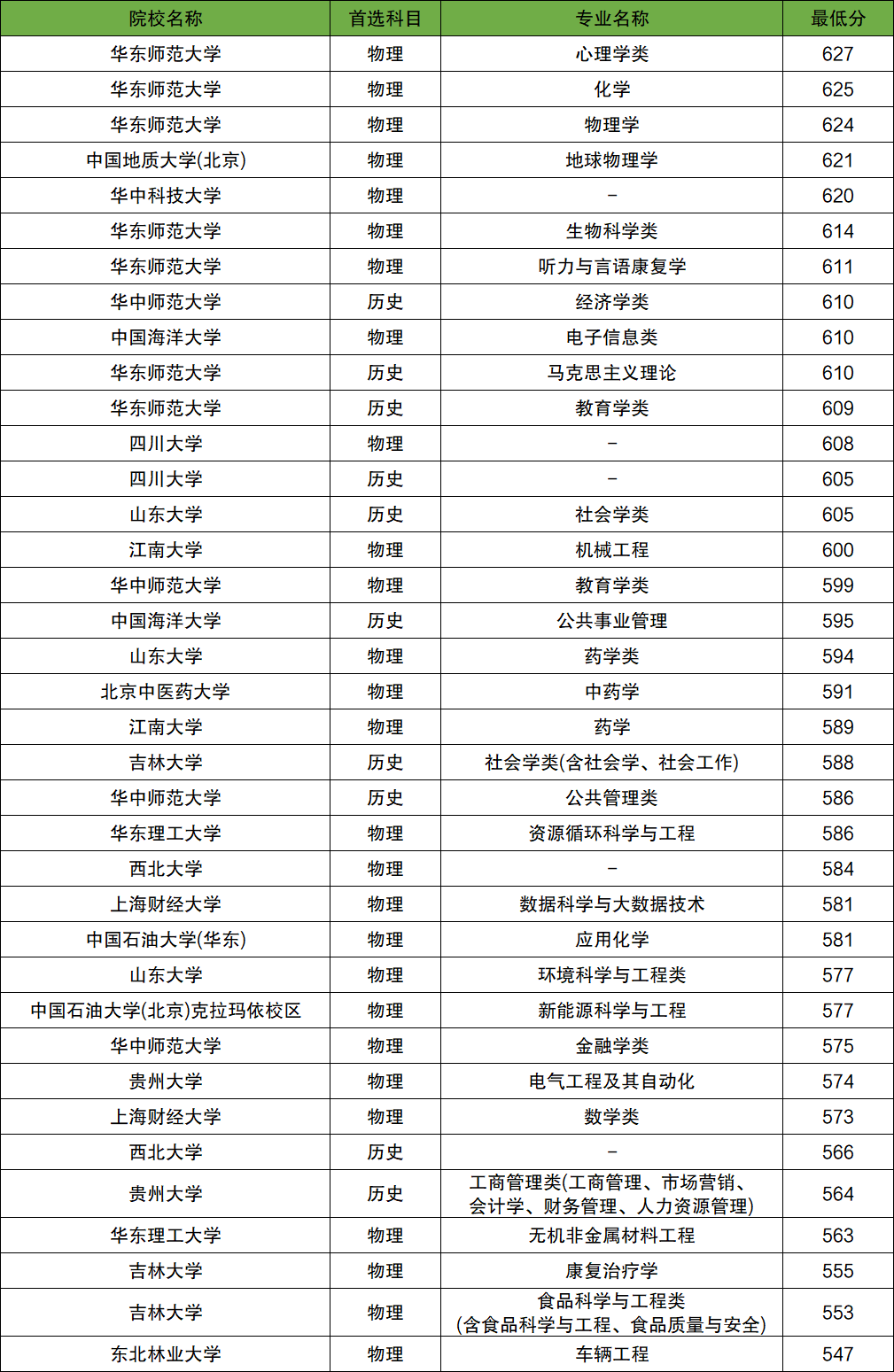 以華東師范大學(xué)為例,物理類各個(gè)專業(yè)最低分?jǐn)?shù)線如下: