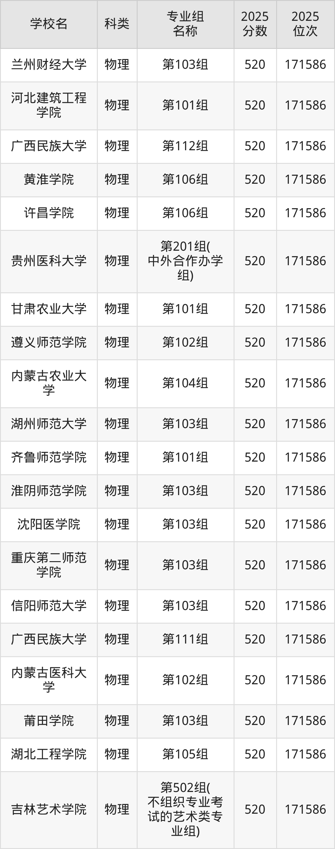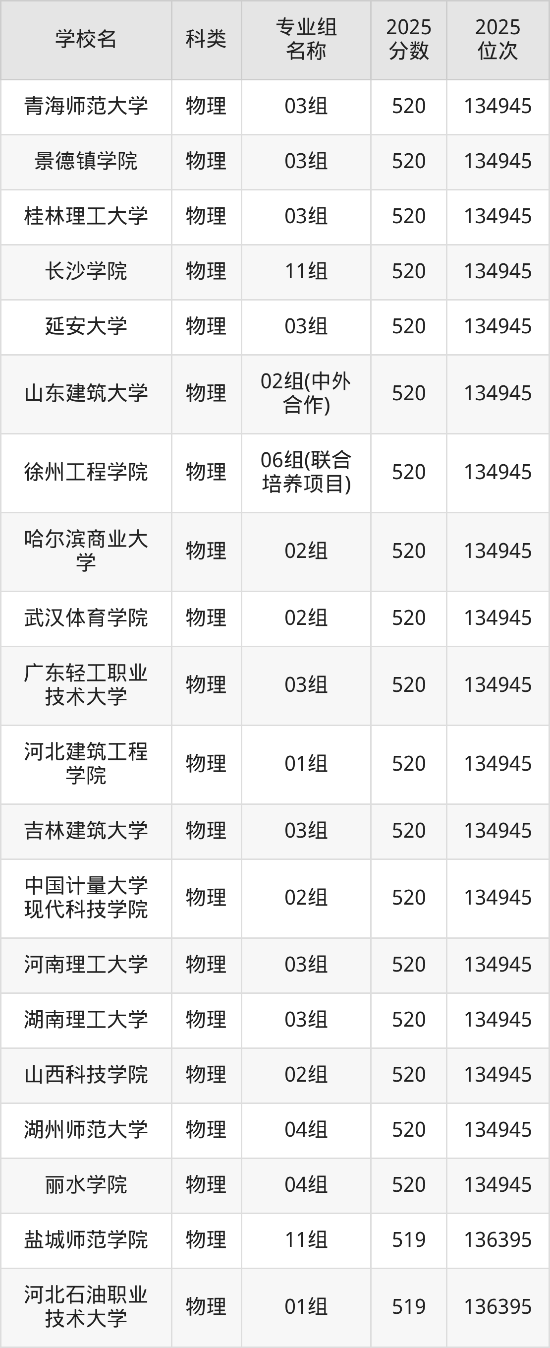 2025年河南物理類本科線為427分,520分能上的二本大學(xué)共計(jì)697所,其中公辦大學(xué)錄取位次排名最低的是白城師范學(xué)院(第201組(中外合作辦學(xué)組)427分),其2025最低位次為348358名。