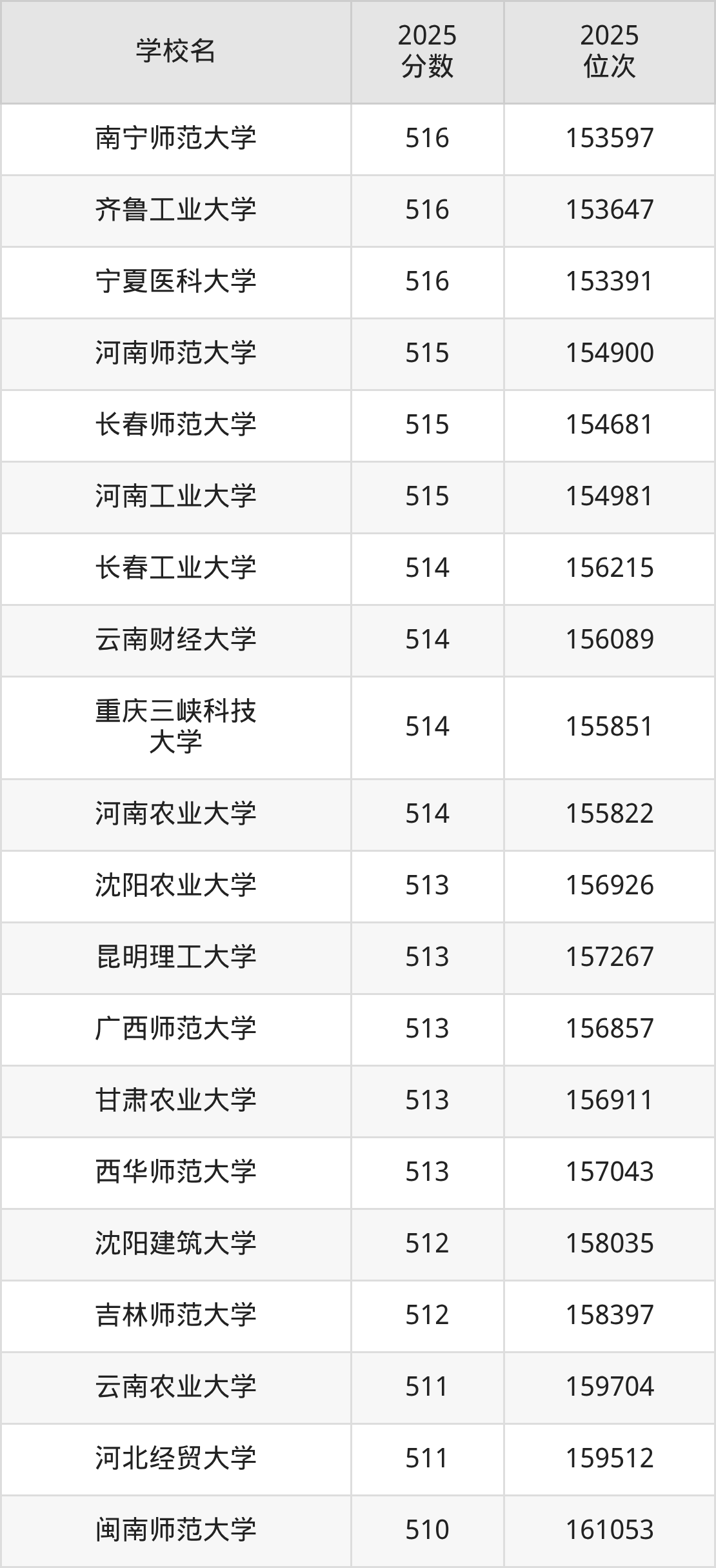 除上述院校外,516分可上的公辦一本大學(xué)還有新疆醫(yī)科大學(xué)(495分,位次178507名)、井岡山大學(xué)(492分,位次181377名)。
