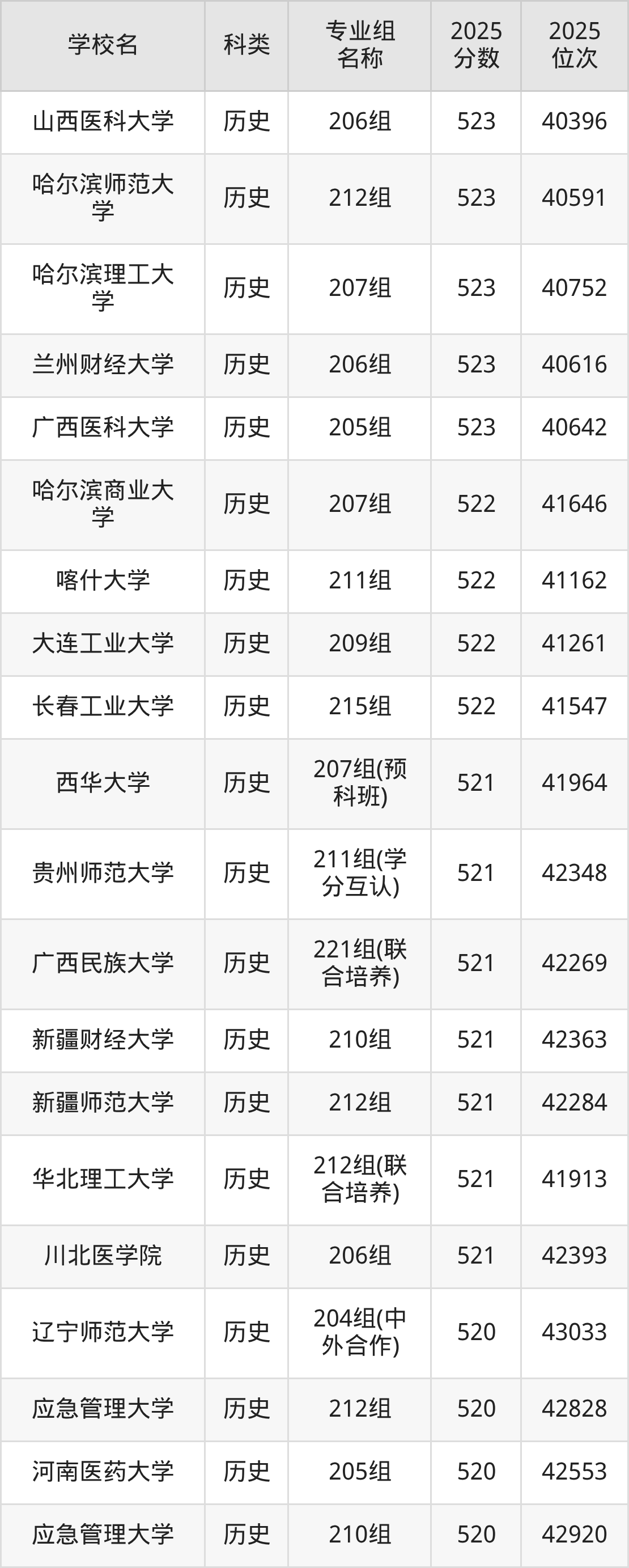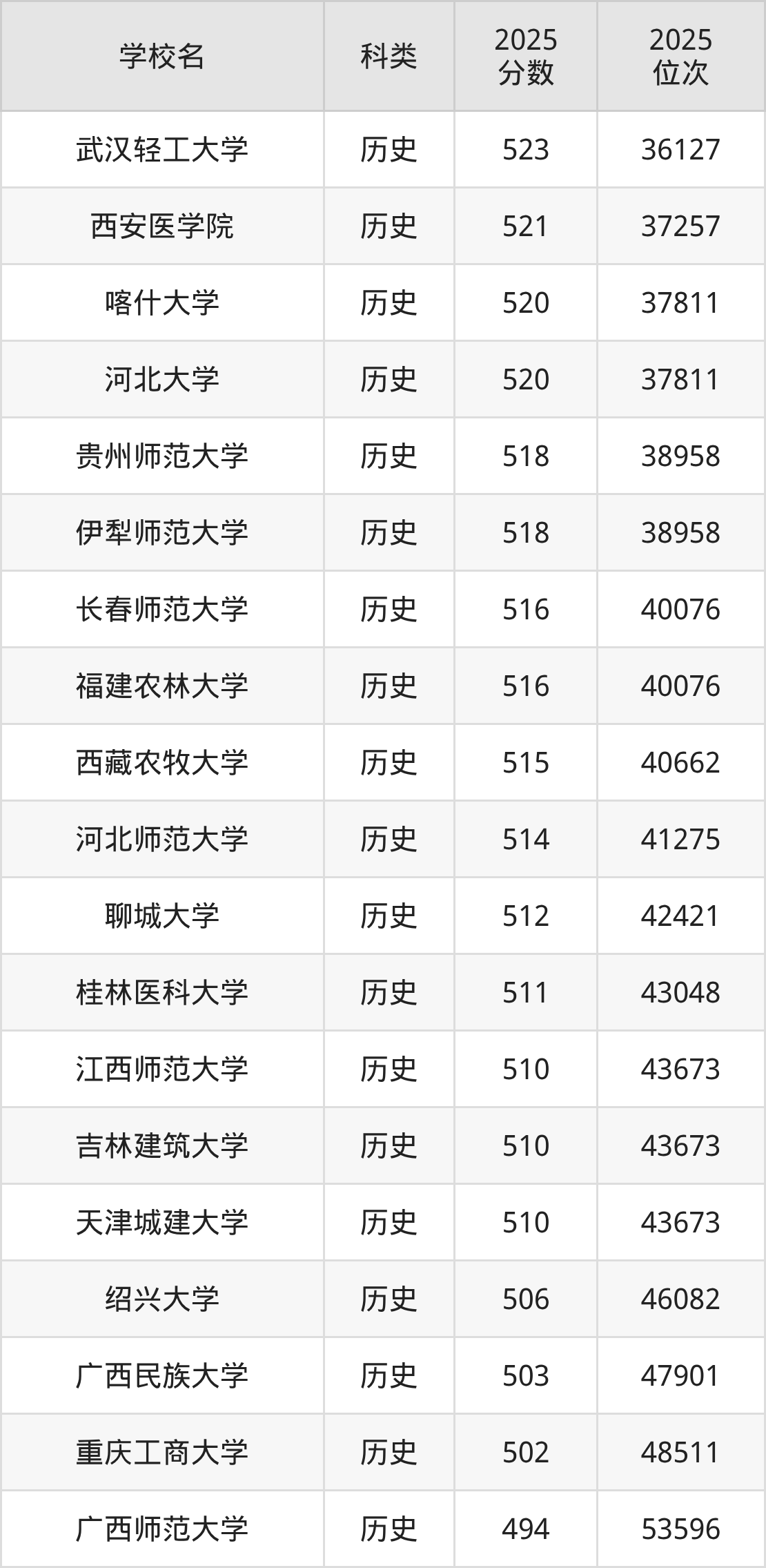 2025年河北歷史類本科線為477分,523分能上的一本大學(xué)共計(jì)19所,其中公辦大學(xué)錄取位次排名最低的是廣西師范大學(xué)(494分),其2025最低位次為53596名。