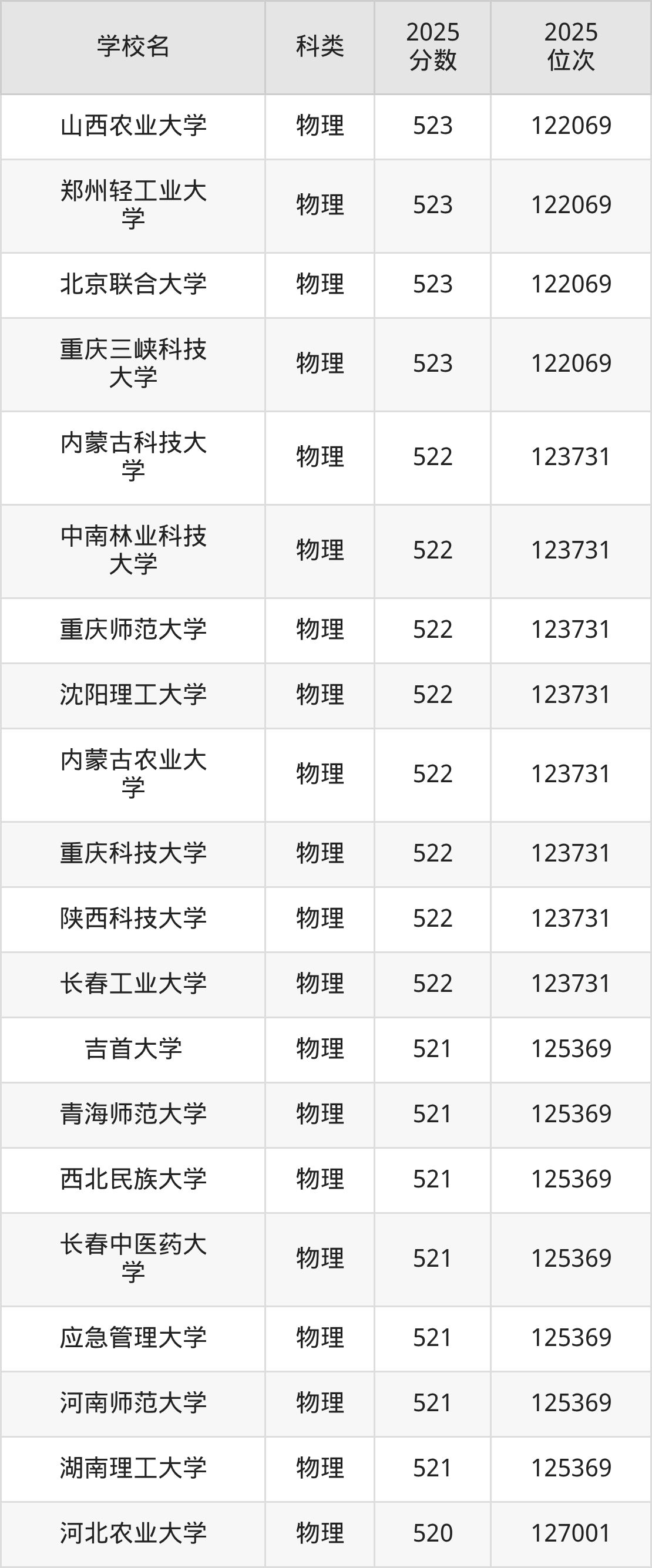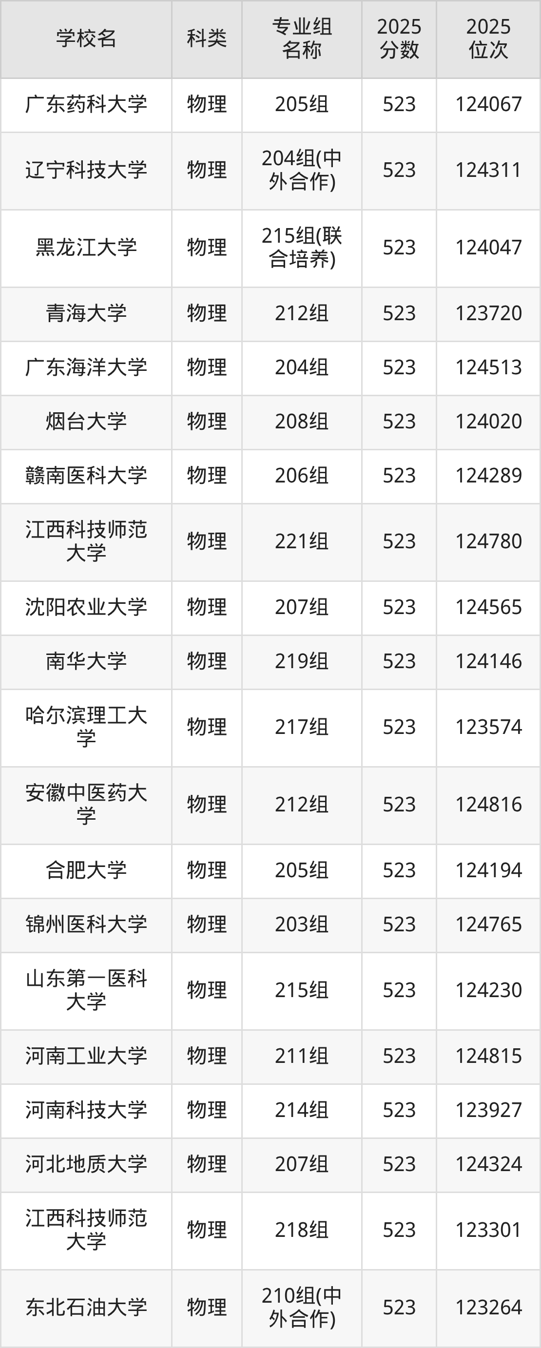 2025年河北物理類本科線為459分,523分能上的一本大學(xué)共計(jì)119所,其中公辦大學(xué)錄取位次排名最低的是廣西民族大學(xué)(470分),其2025最低位次為208299名。