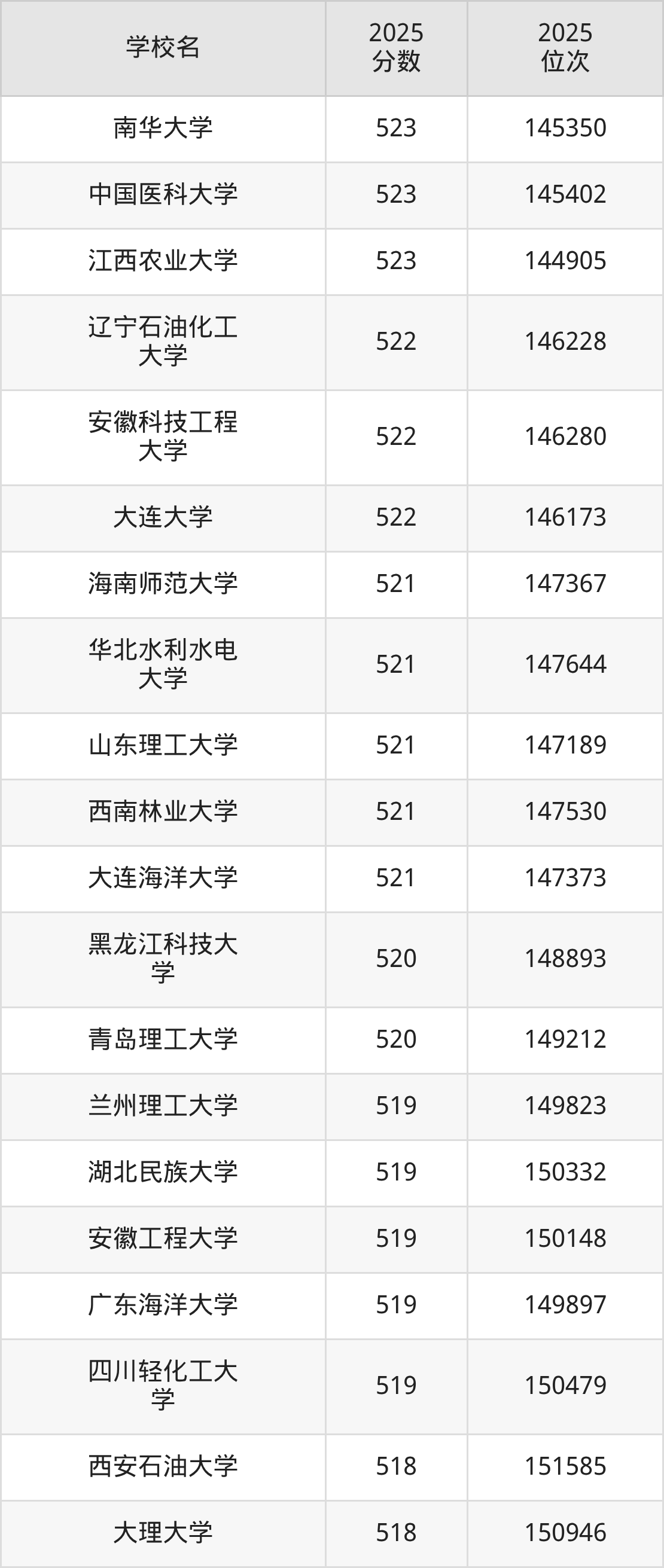 除上述院校外,523分可上的公辦一本大學(xué)還有廣西民族大學(xué)(218組521分,位次126907名)、貴州醫(yī)科大學(xué)(207組518分,位次132727名)。