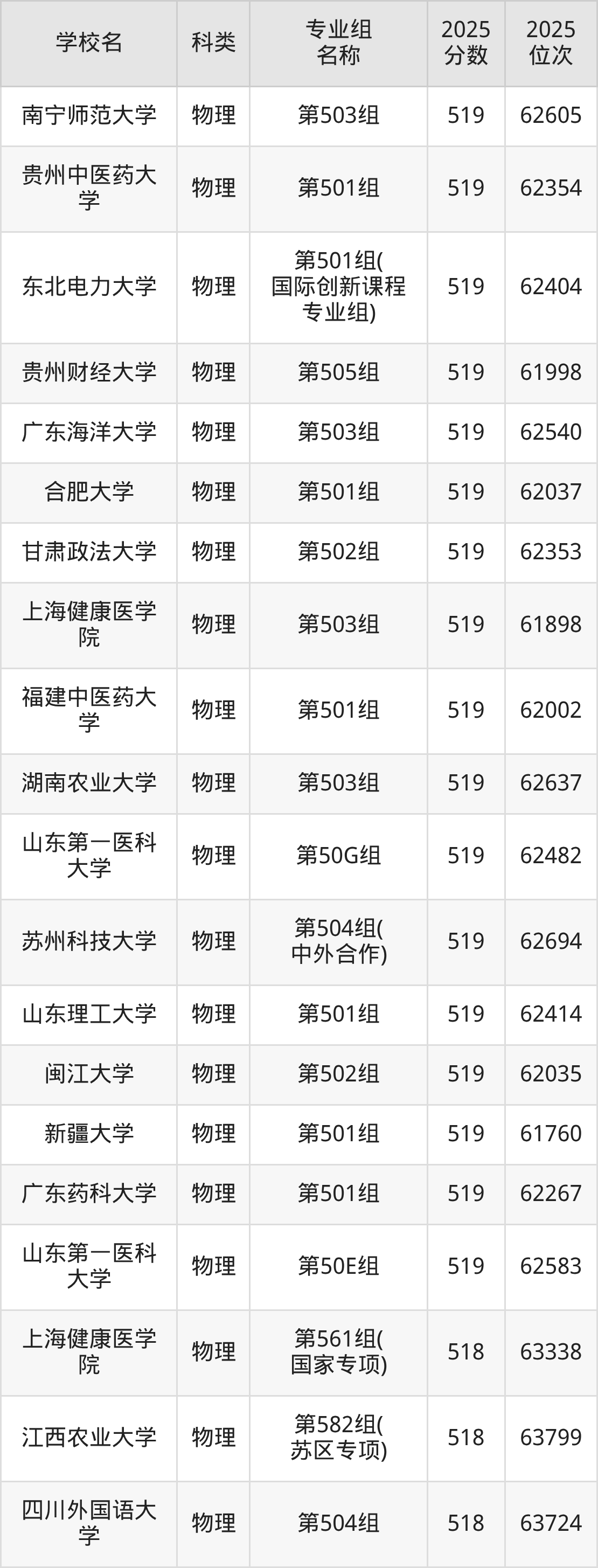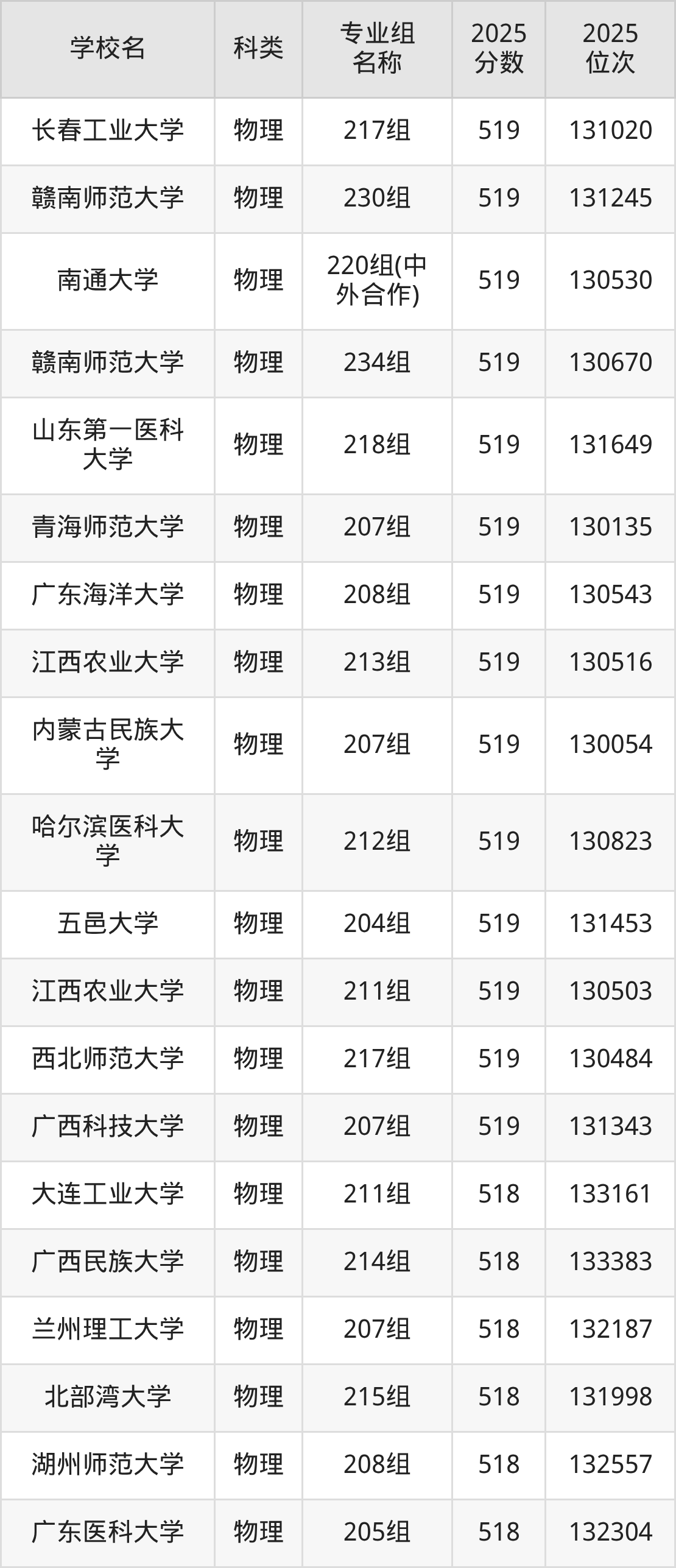 以江西物理類為例,519分能上的一本大學有北方民族大學(位次排名80266名)、寧夏醫(yī)科大學(位次排名101958名)、哈爾濱理工大學(位次排名155044名)。