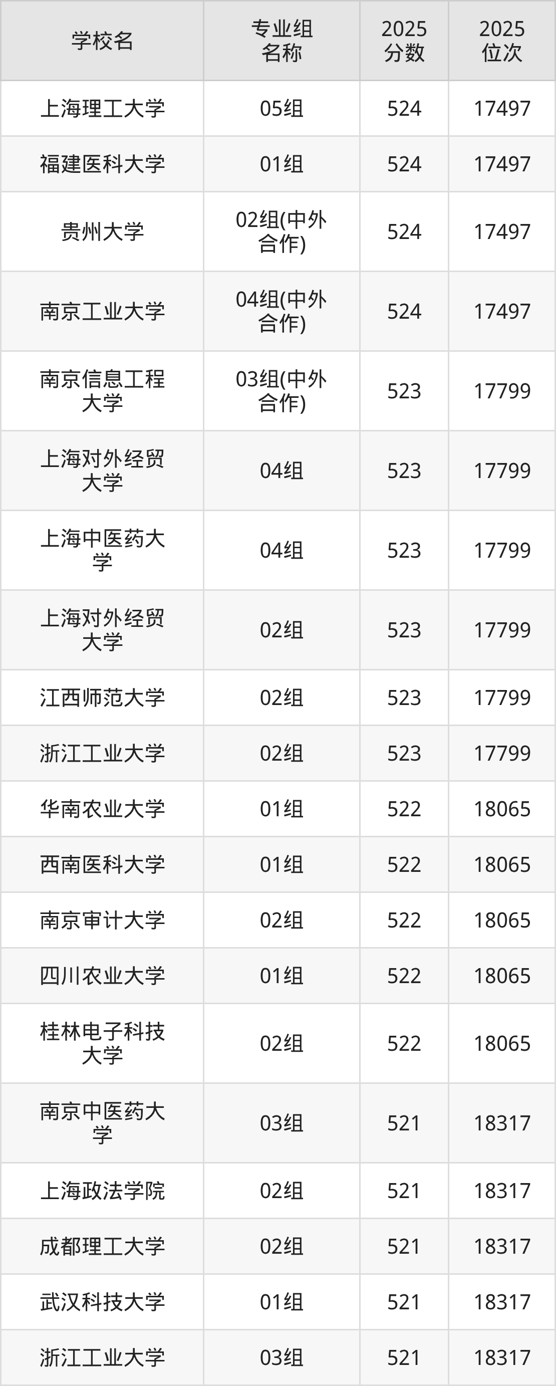 2025年上海本科線(xiàn)為402分,524分能上的一本大學(xué)共計(jì)265所,其中公辦大學(xué)錄取位次排名最低的是貴州財(cái)經(jīng)大學(xué)(02組(中外合作)402分),其2025最低位次為49276名。