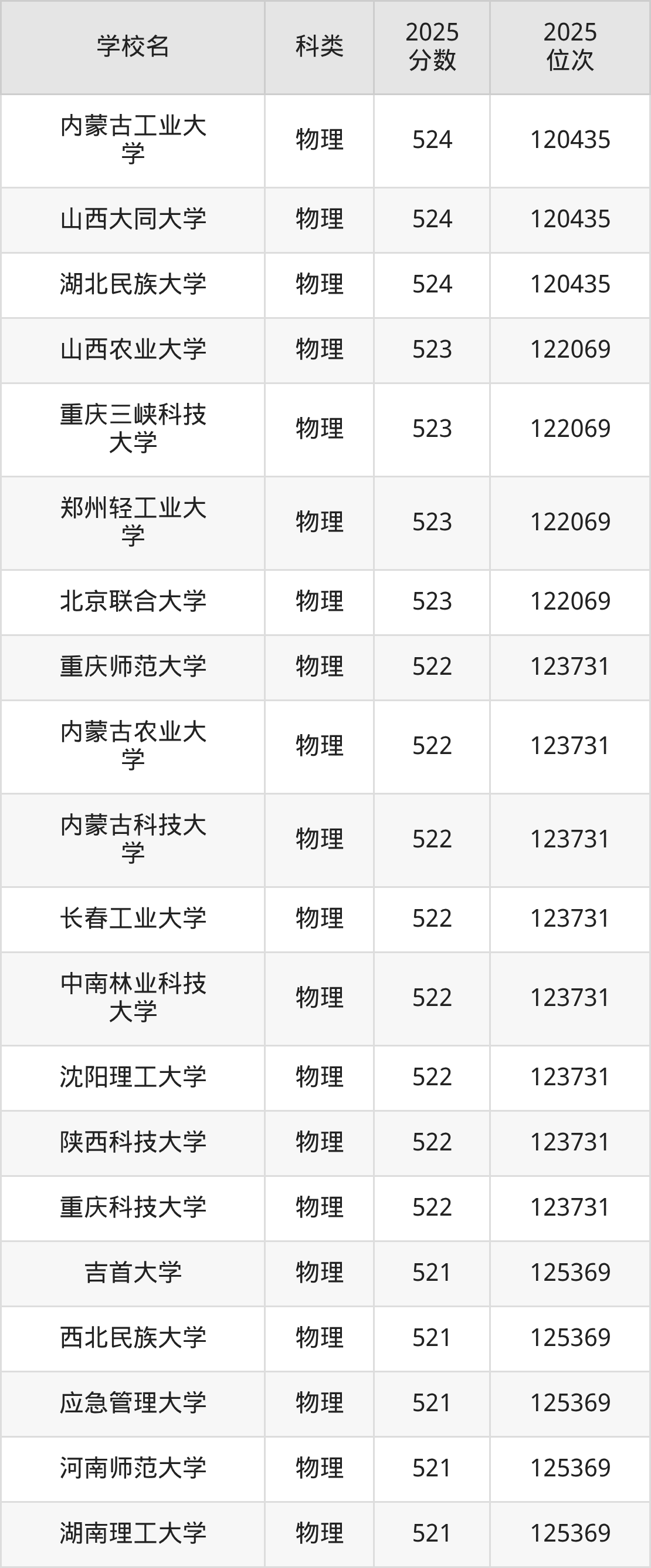 2025年河北物理類(lèi)本科線(xiàn)為459分,524分能上的一本大學(xué)共計(jì)122所,其中最低分公辦院校為廣西民族大學(xué)(470分),對(duì)應(yīng)最低位次為208299名。因此想上公辦本科的考生省排名位次至少要在208299名以?xún)?nèi)。