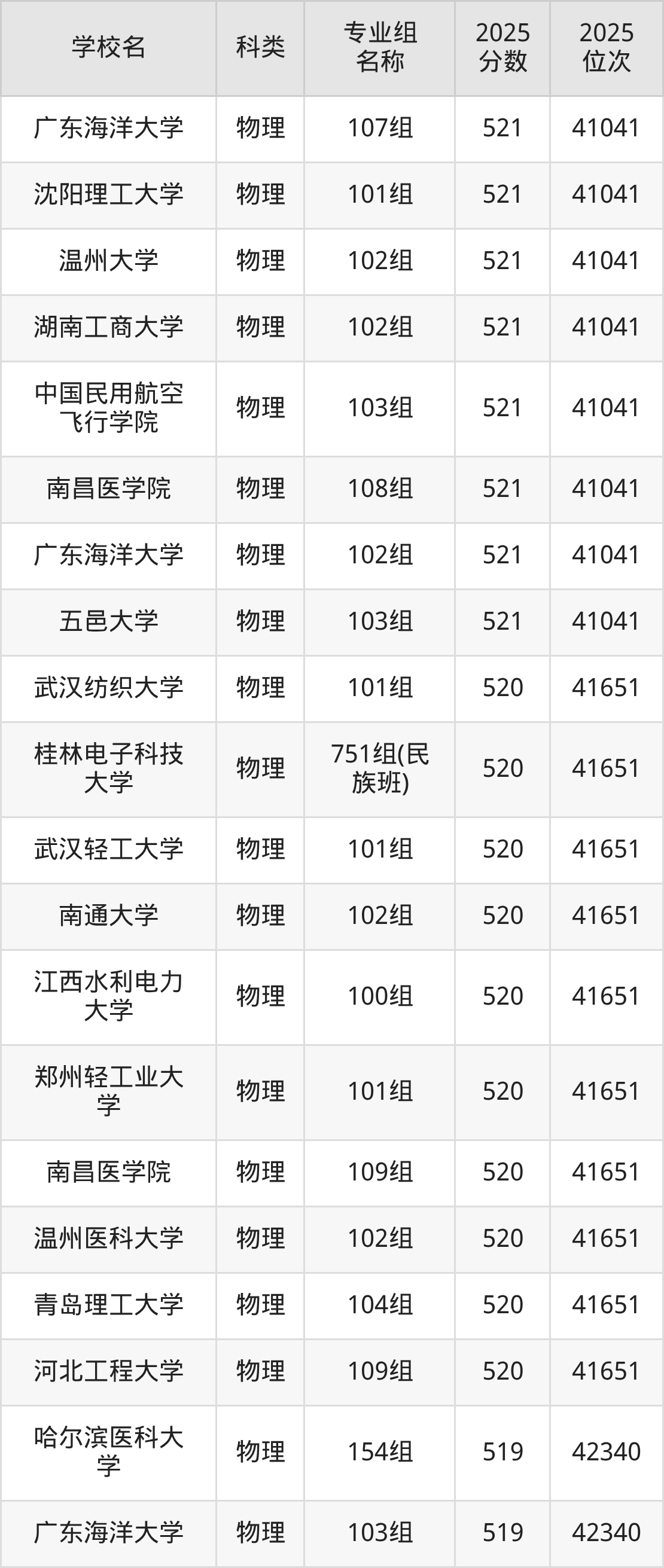 以廣西物理類為例,521分能上的二本大學(xué)有南通大學(xué)(位次排名41651名)、山西大同大學(xué)(位次排名102067名)、鄭州工程技術(shù)學(xué)院(位次排名122380名)。
