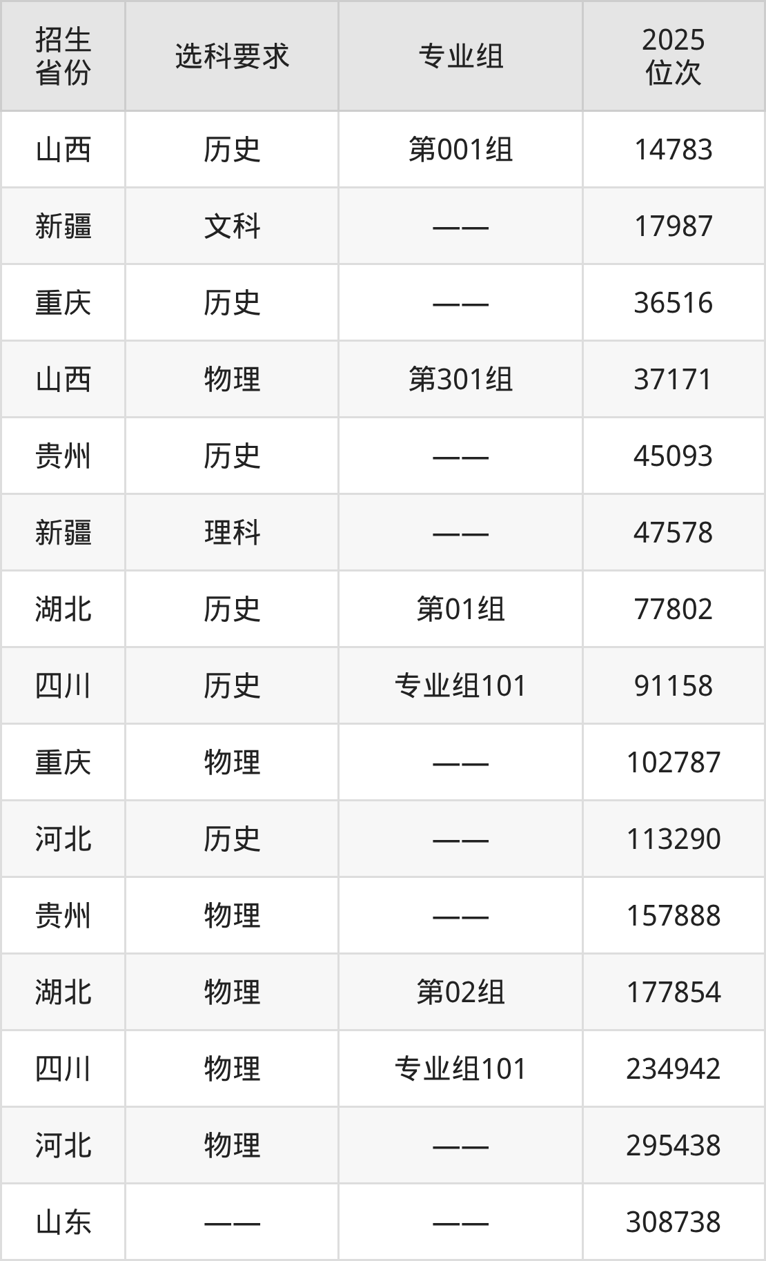 河北司法警官職業(yè)學(xué)院2025年在全國各省的位次差異較大,最高位次是14783位(山西歷史類)、最低位次是308738位(山東)。各省具體位次請(qǐng)看下圖: