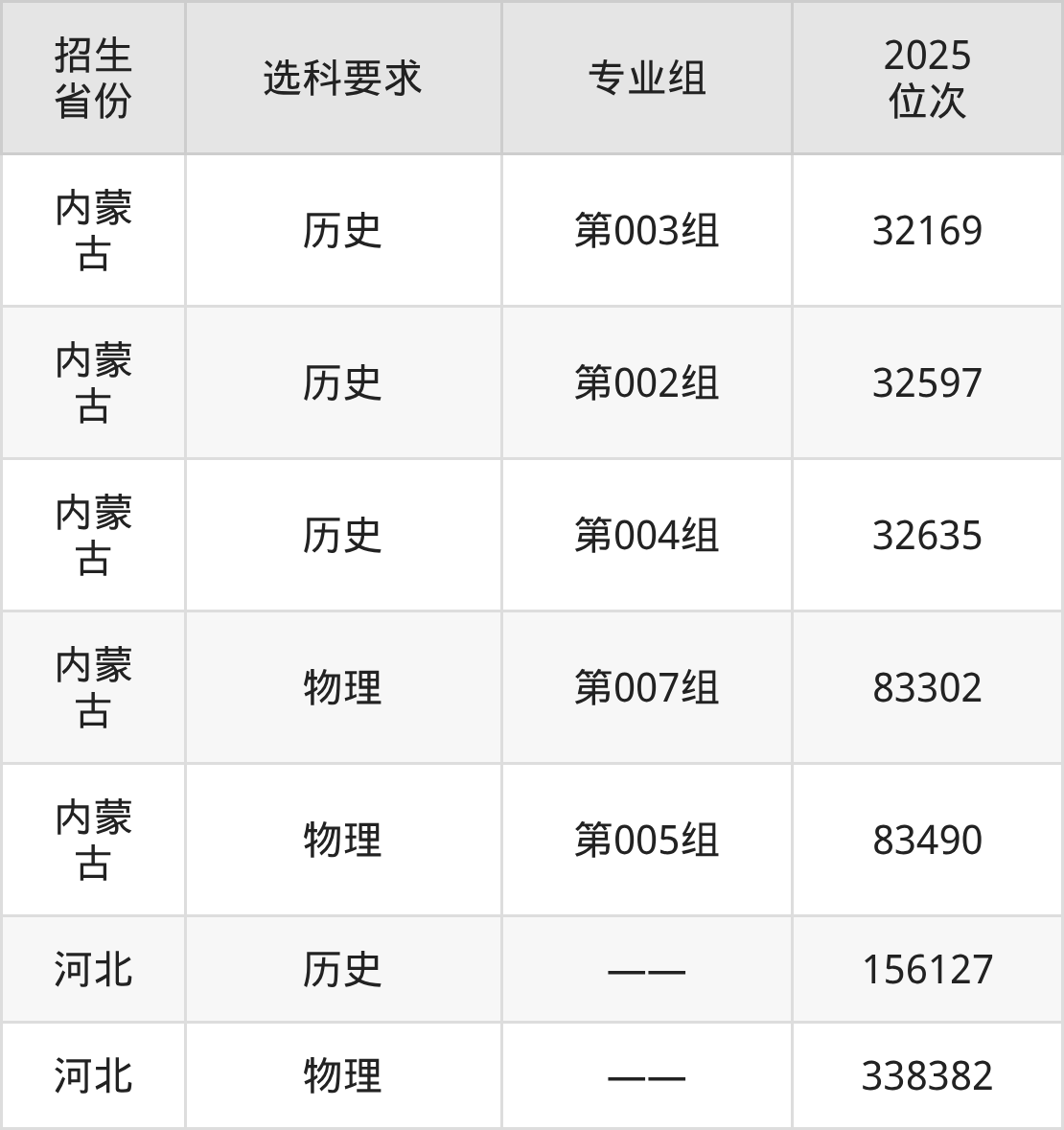內(nèi)蒙古科技職業(yè)學(xué)院2025年在全國(guó)各省的位次差異較大,最高位次是32169位(內(nèi)蒙古歷史類)、最低位次是338382位(河北物理類)。各省具體位次請(qǐng)看下圖: