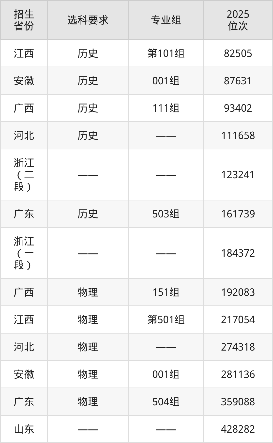 淮北職業(yè)技術(shù)學院2025年在全國各省的位次差異較大,最高位次是82505位(江西歷史類)、最低位次是428282位(山東)。各省具體位次請看下圖: