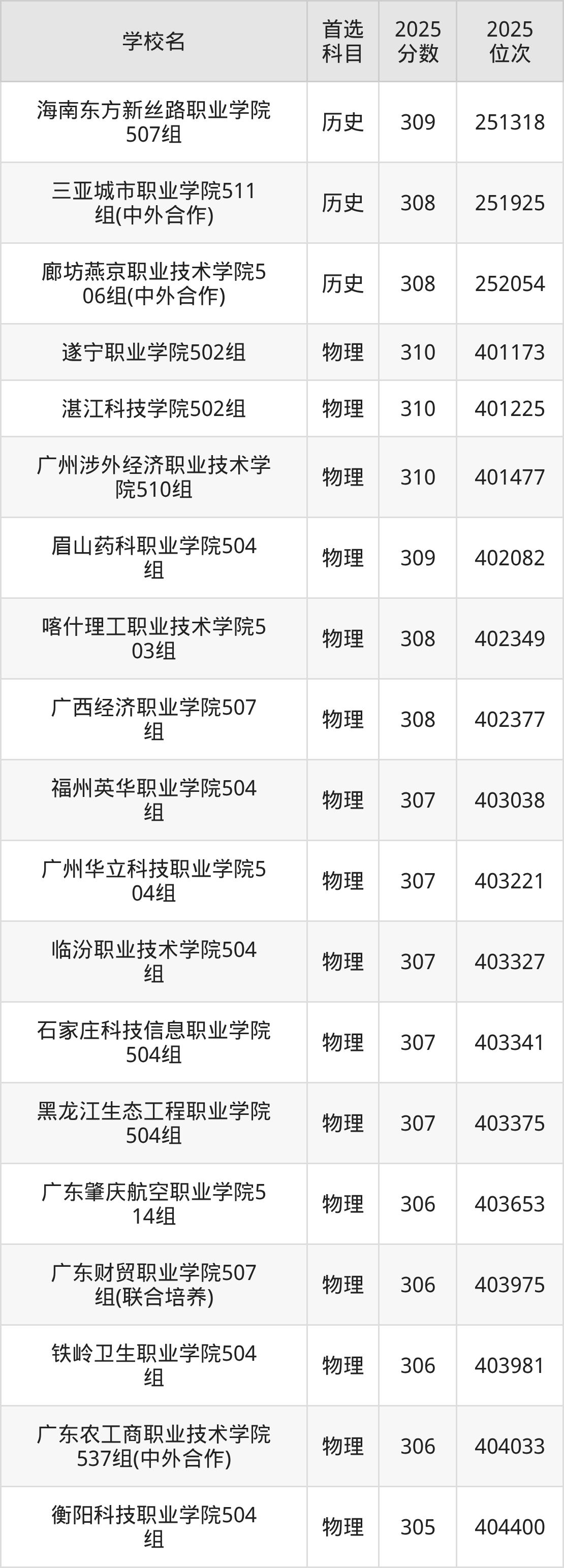 歷史組分數(shù)線在305分的大學(xué)及專業(yè)組:海南東方新絲路職業(yè)學(xué)院507組、三亞城市職業(yè)學(xué)院511組(中外合作)、廊坊燕京職業(yè)技術(shù)學(xué)院506組(中外合作)等;