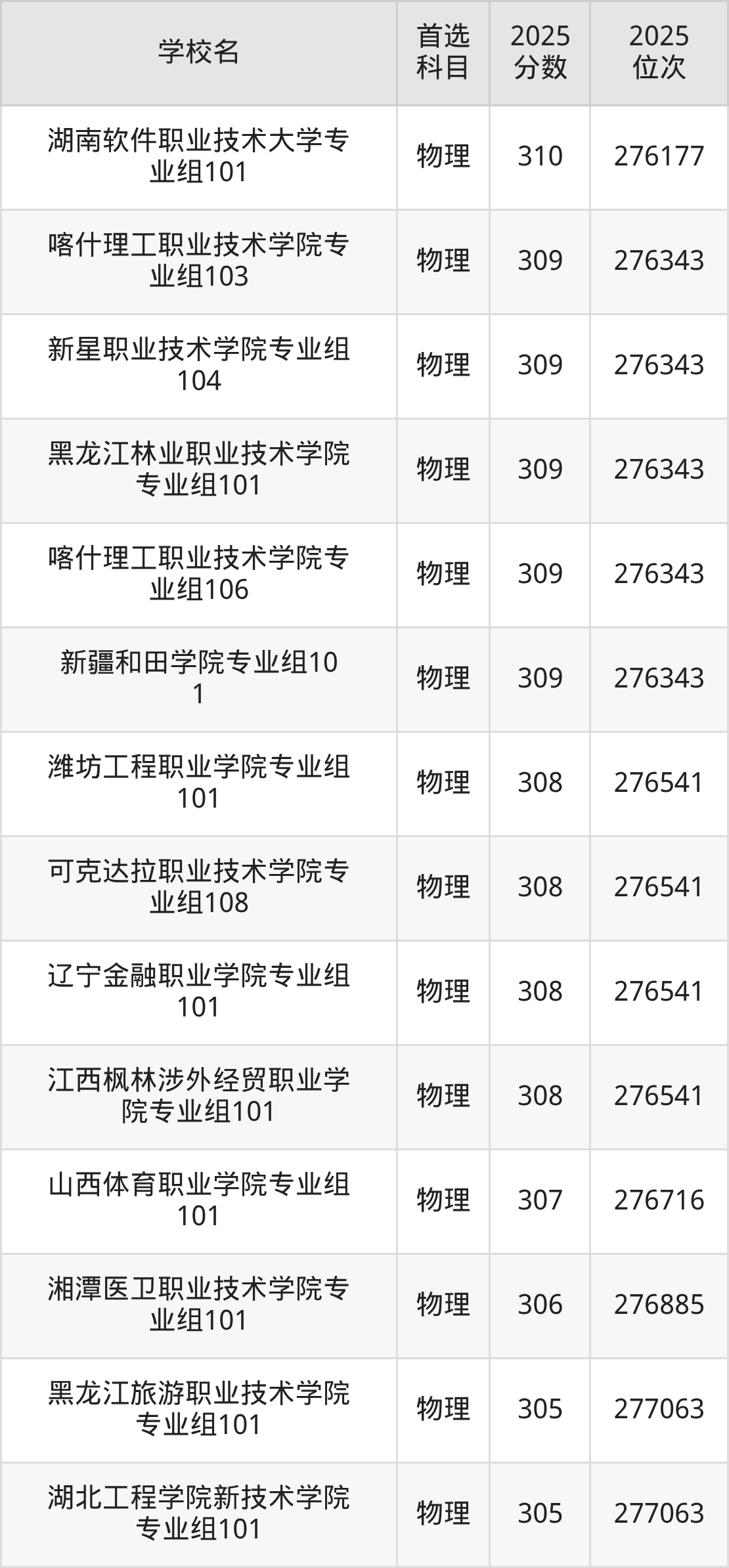 物理組分數(shù)剛好為305分的大學(xué):黑龍江旅游職業(yè)技術(shù)學(xué)院、湖北工程學(xué)院新技術(shù)學(xué)院等。