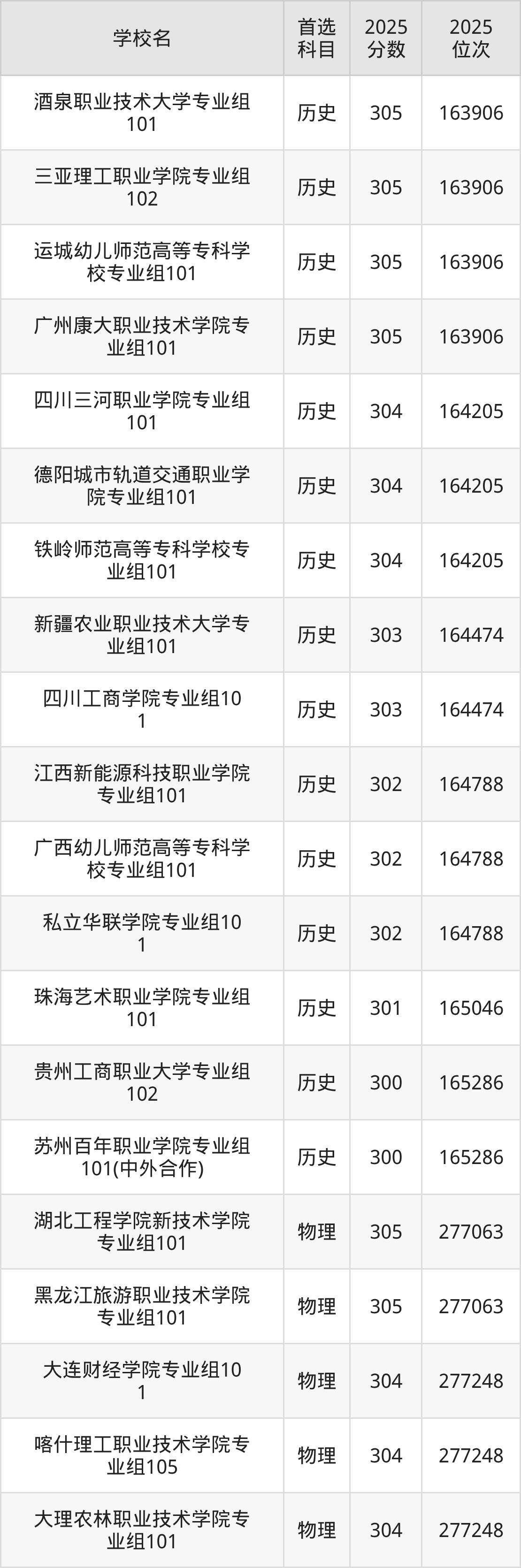 歷史組分數(shù)剛好為300分的大學:貴州工商職業(yè)大學、蘇州百年職業(yè)學院等;