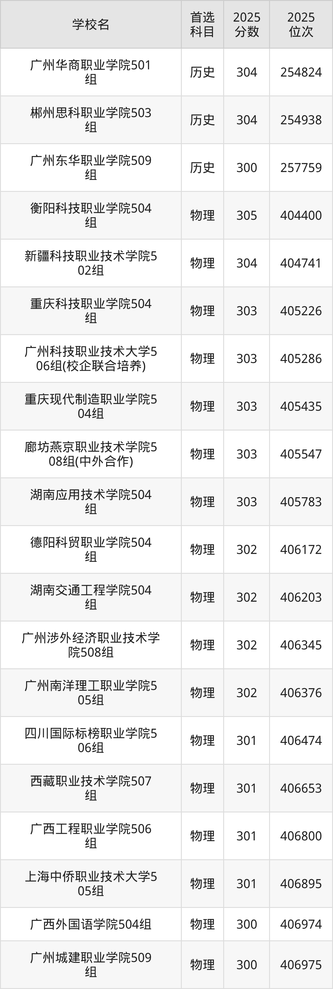 歷史組分數(shù)線在300分的大學及專業(yè)組:廣州華商職業(yè)學院501組、郴州思科職業(yè)學院503組、廣州東華職業(yè)學院509組等;