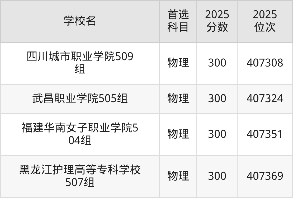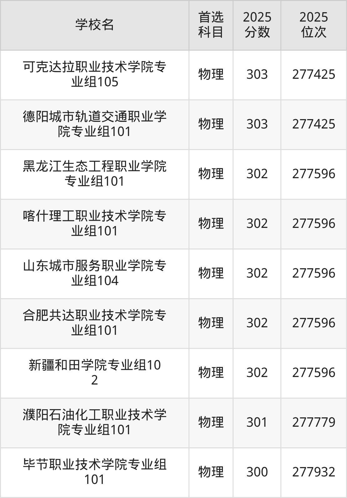 物理組分數(shù)線在300分的大學及專業(yè)組:衡陽科技職業(yè)學院504組、新疆科技職業(yè)技術學院502組、重慶科技職業(yè)學院504組等。