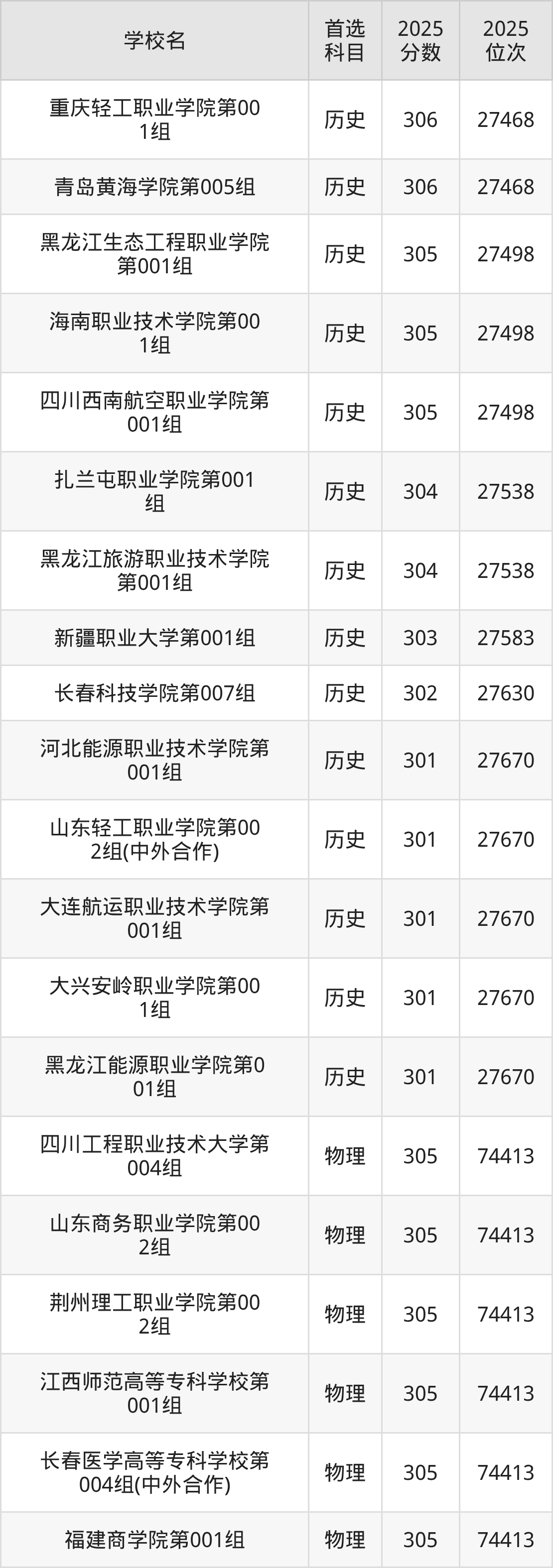 歷史組分數(shù)線在301分的大學及專業(yè)組:重慶輕工職業(yè)學院第001組、青島黃海學院第005組、黑龍江生態(tài)工程職業(yè)學院第001組等;