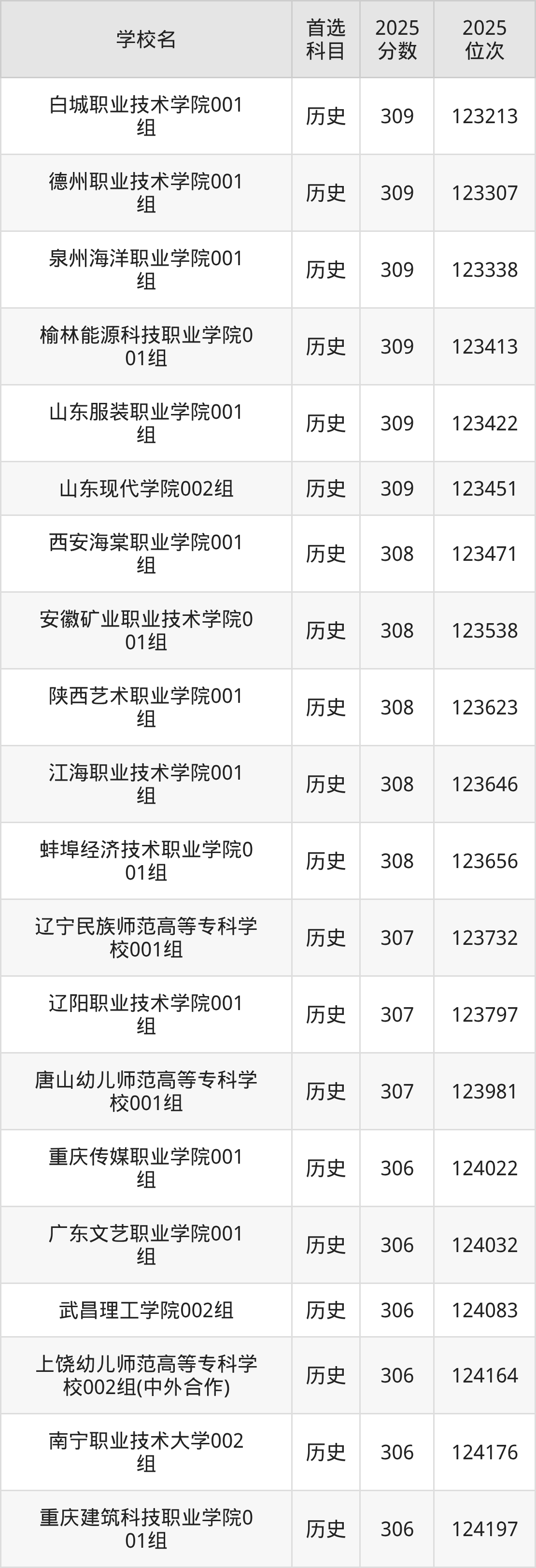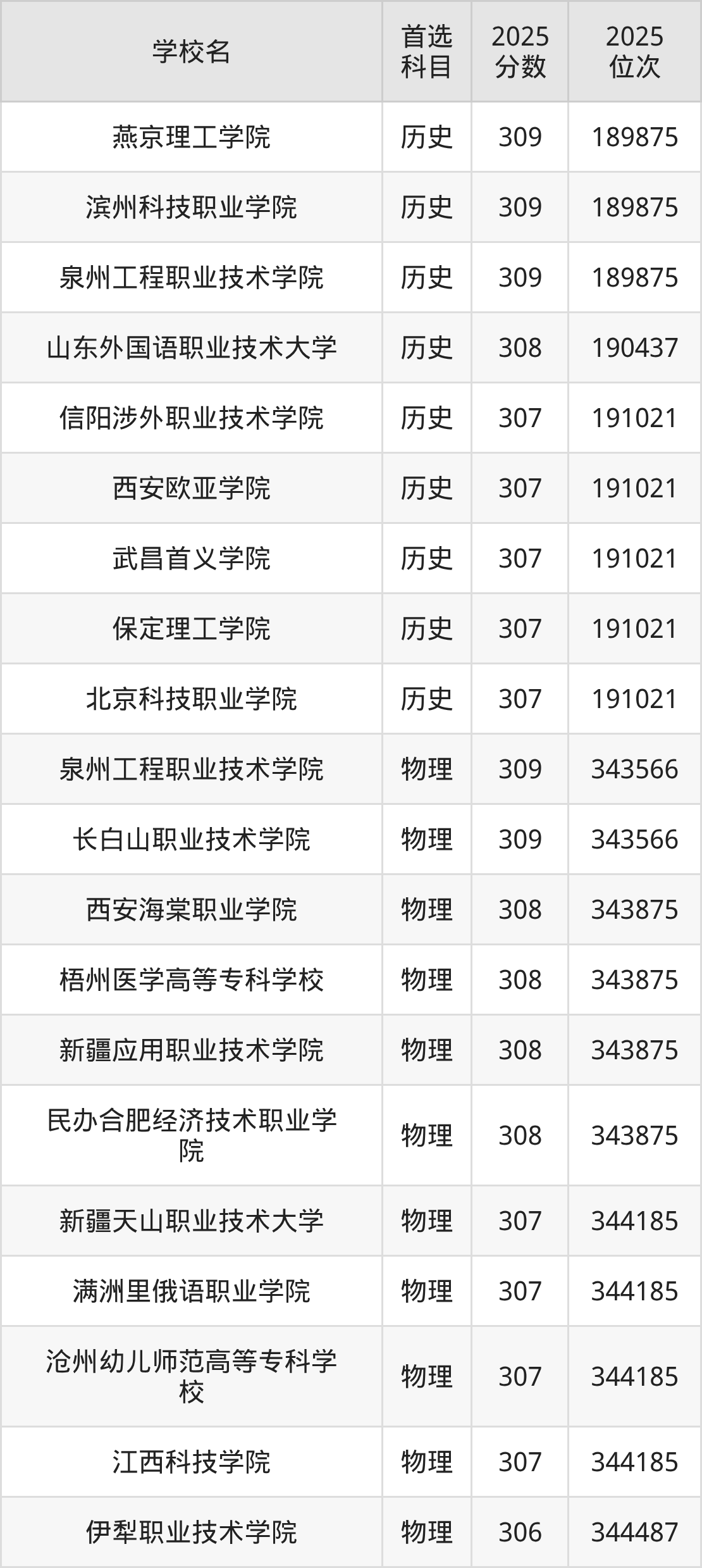 歷史組分數(shù)線在304分的大學:燕京理工學院、濱州科技職業(yè)學院、泉州工程職業(yè)技術學院等;