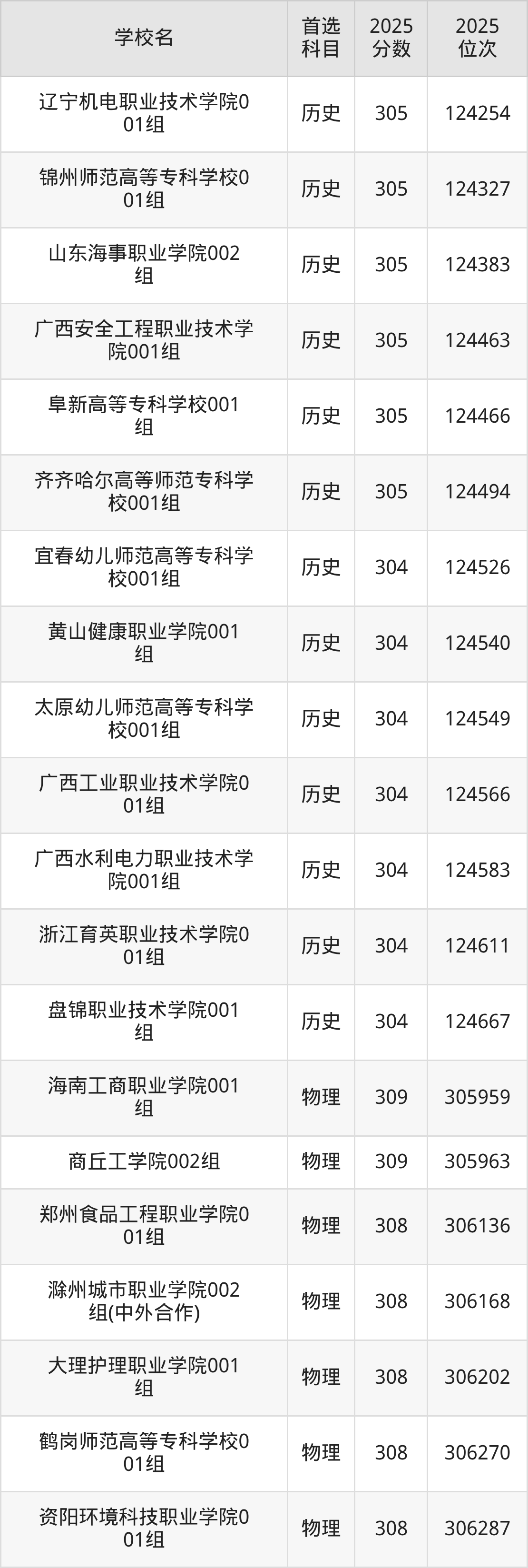 歷史組分數(shù)剛好為304分的大學:宜春幼兒師范高等專科學校、黃山健康職業(yè)學院、太原幼兒師范高等??茖W校、廣西工業(yè)職業(yè)技術學院等;