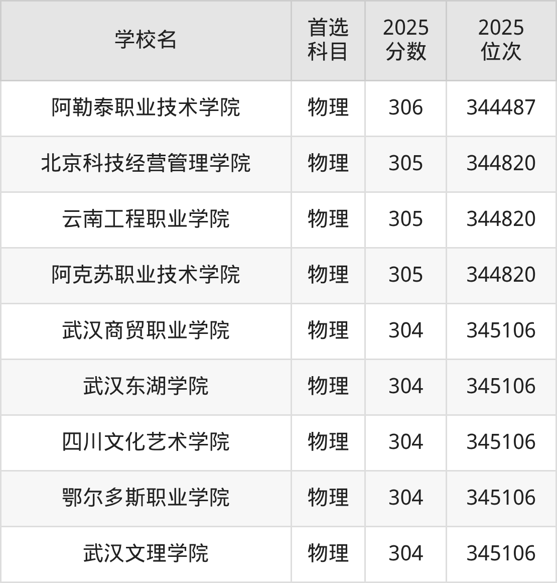 | 武漢鐵路橋梁職業(yè)學院 | 物理 | 307 | 196424 |