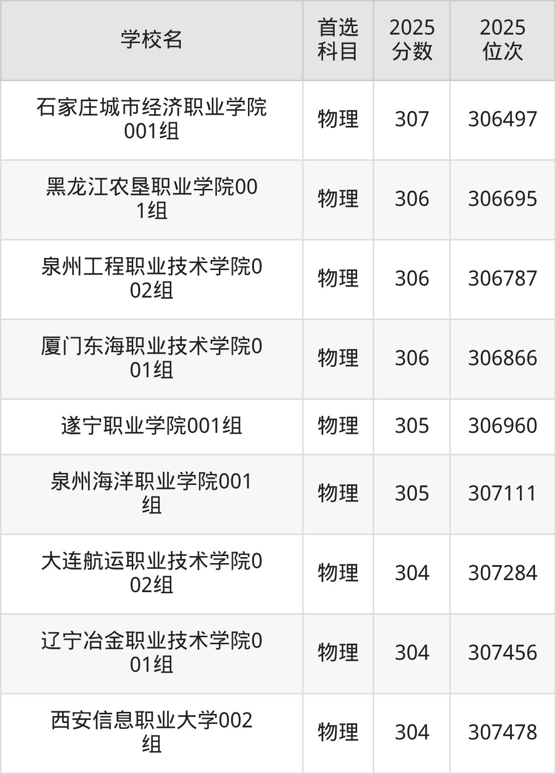 物理組分數(shù)線在304分的大學:泉州工程職業(yè)技術學院、長白山職業(yè)技術學院、西安海棠職業(yè)學院等。