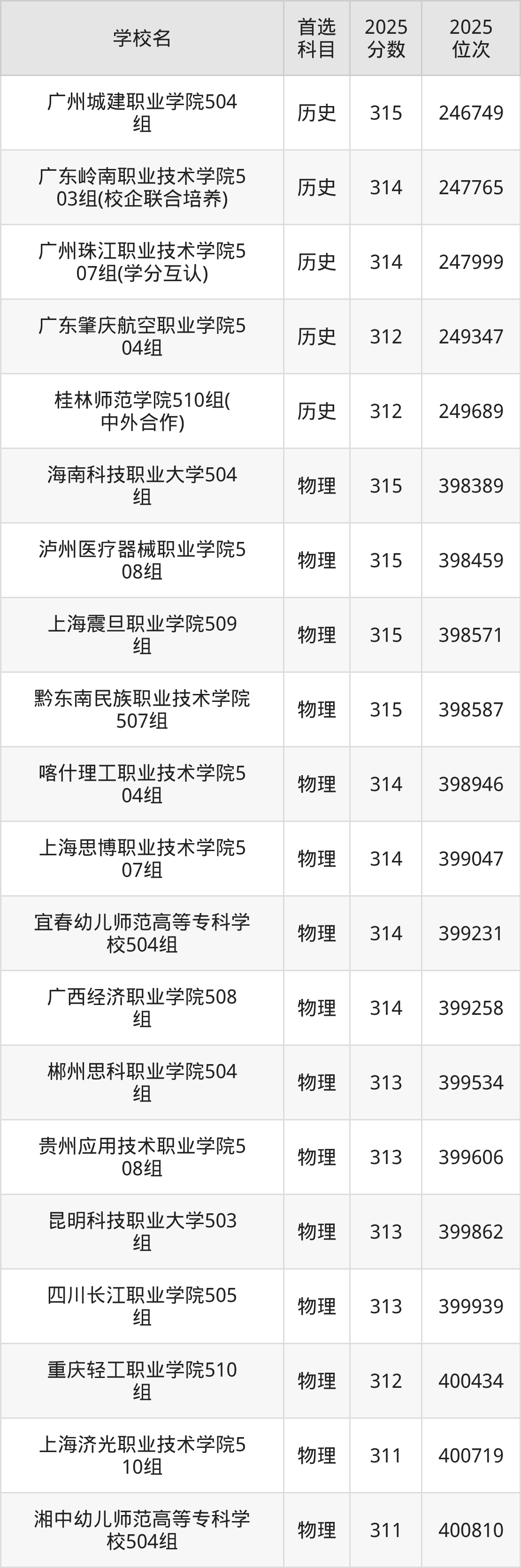 歷史組分?jǐn)?shù)線在310分的大學(xué)及專業(yè)組:廣州城建職業(yè)學(xué)院504組、廣東嶺南職業(yè)技術(shù)學(xué)院503組(校企聯(lián)合培養(yǎng))、廣州珠江職業(yè)技術(shù)學(xué)院507組(學(xué)分互認(rèn))等;