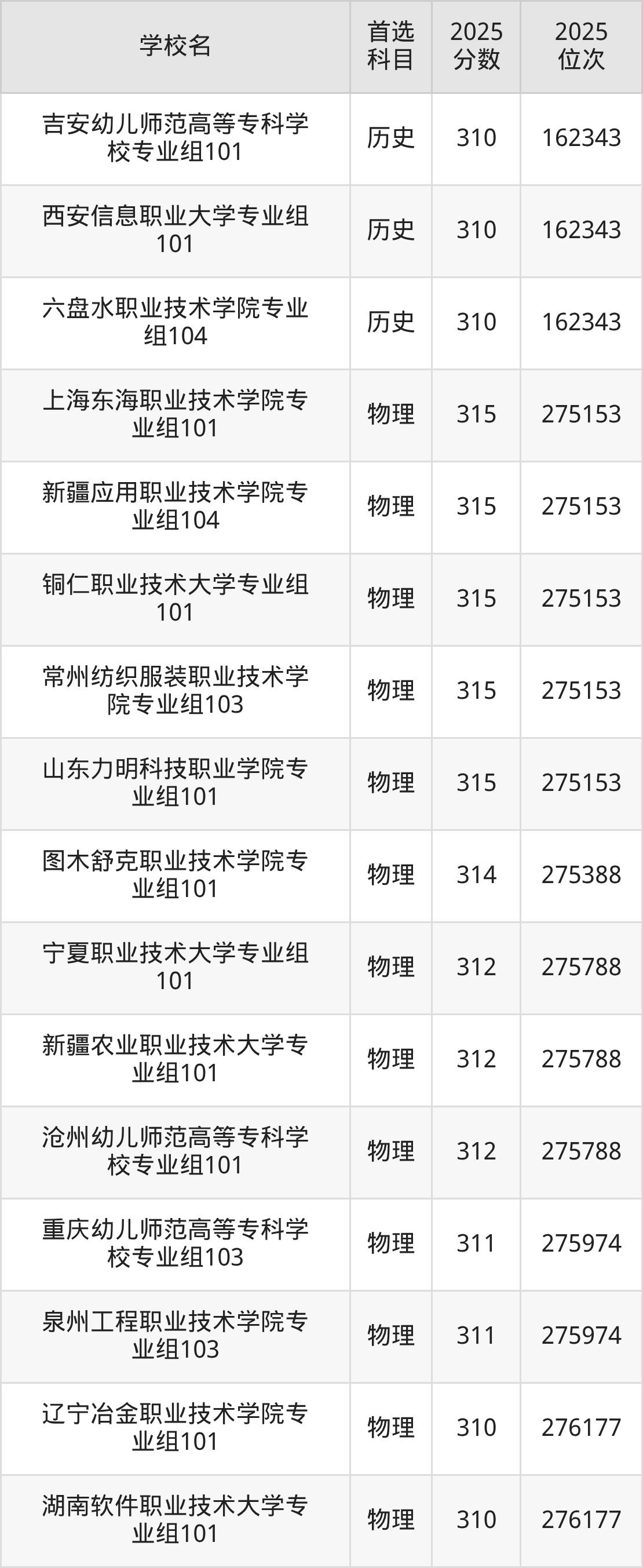 歷史組分?jǐn)?shù)剛好為310分的大學(xué):蘭州現(xiàn)代職業(yè)學(xué)院、吉安幼兒師范高等??茖W(xué)校、西安信息職業(yè)大學(xué)、六盤水職業(yè)技術(shù)學(xué)院等;