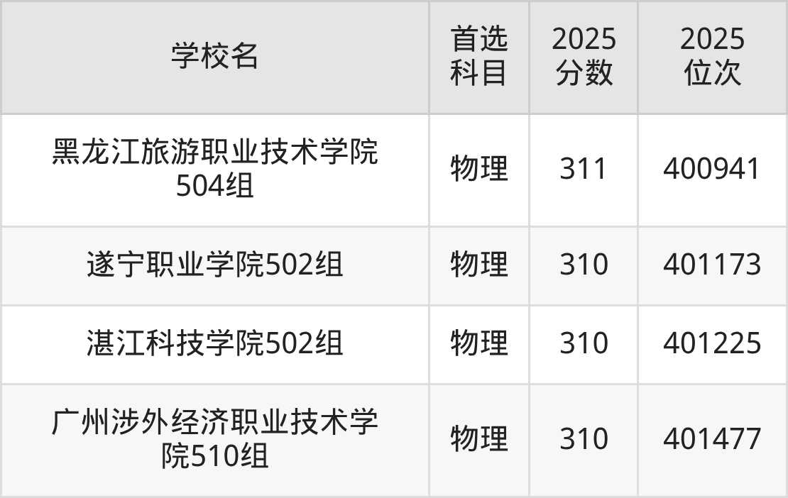 物理組分?jǐn)?shù)剛好為310分的大學(xué):遼寧冶金職業(yè)技術(shù)學(xué)院、湖南軟件職業(yè)技術(shù)大學(xué)等。