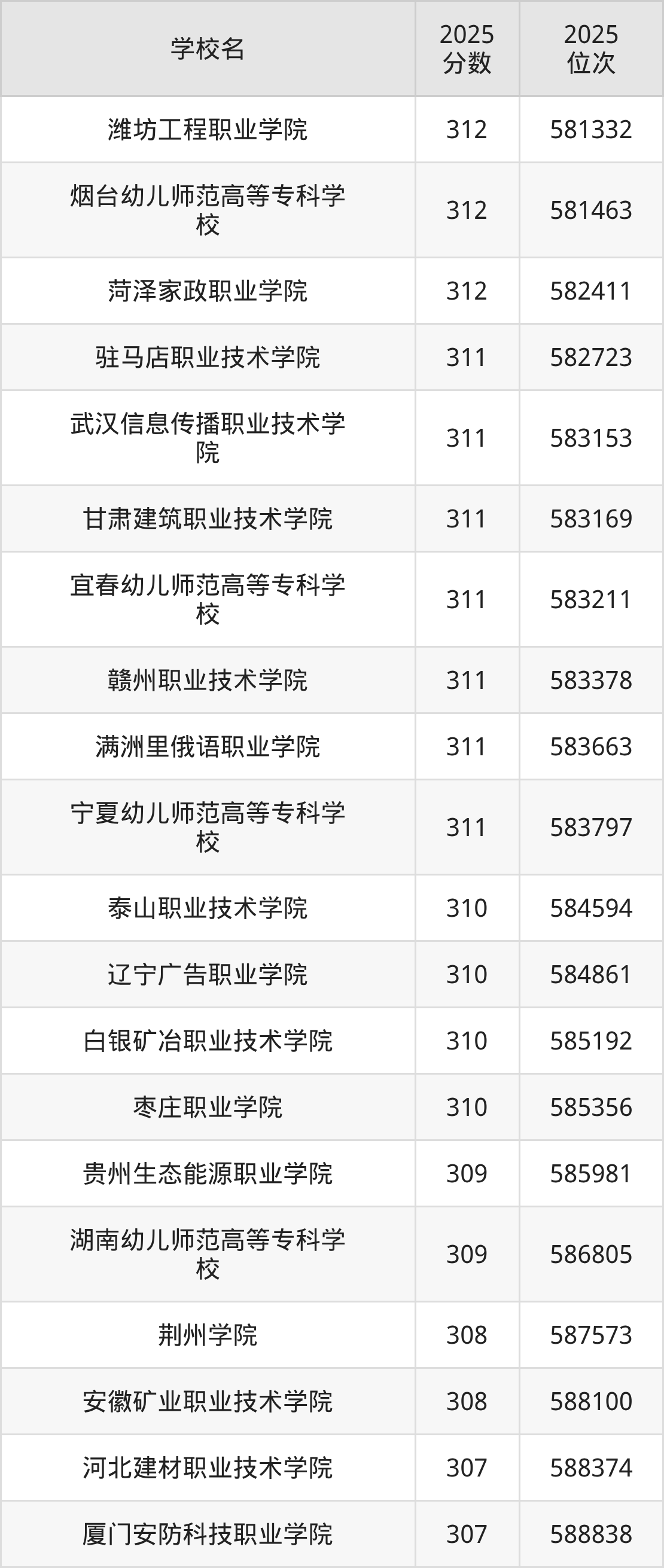 分?jǐn)?shù)線在307分的大學(xué):濰坊工程職業(yè)學(xué)院、煙臺幼兒師范高等專科學(xué)校、菏澤家政職業(yè)學(xué)院等。