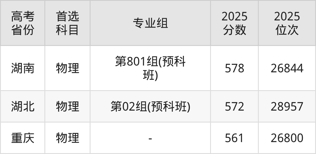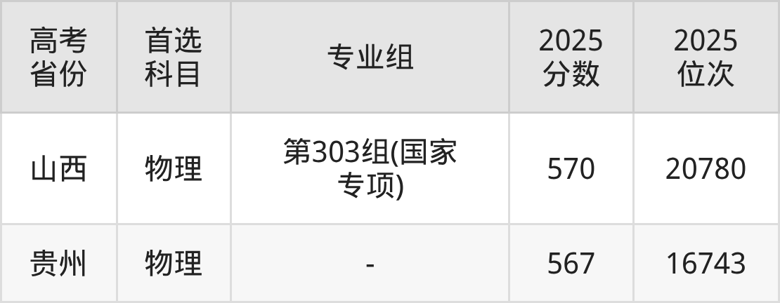 | 高考 省份 | 專業(yè)組 | 選科要求 | 2025 分?jǐn)?shù) | 2025 位次 |