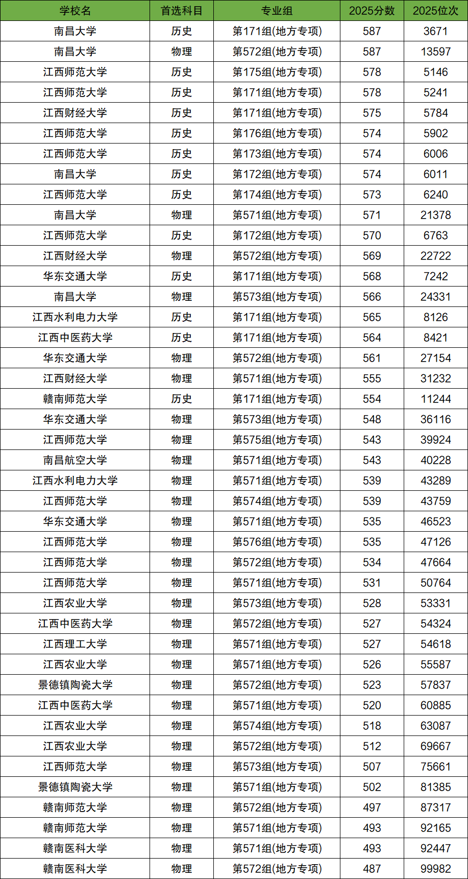 2025年江西地方專項計劃的分數(shù)線為:487分-587分,其中,歷史類487分-587分、物理類535分-568分。