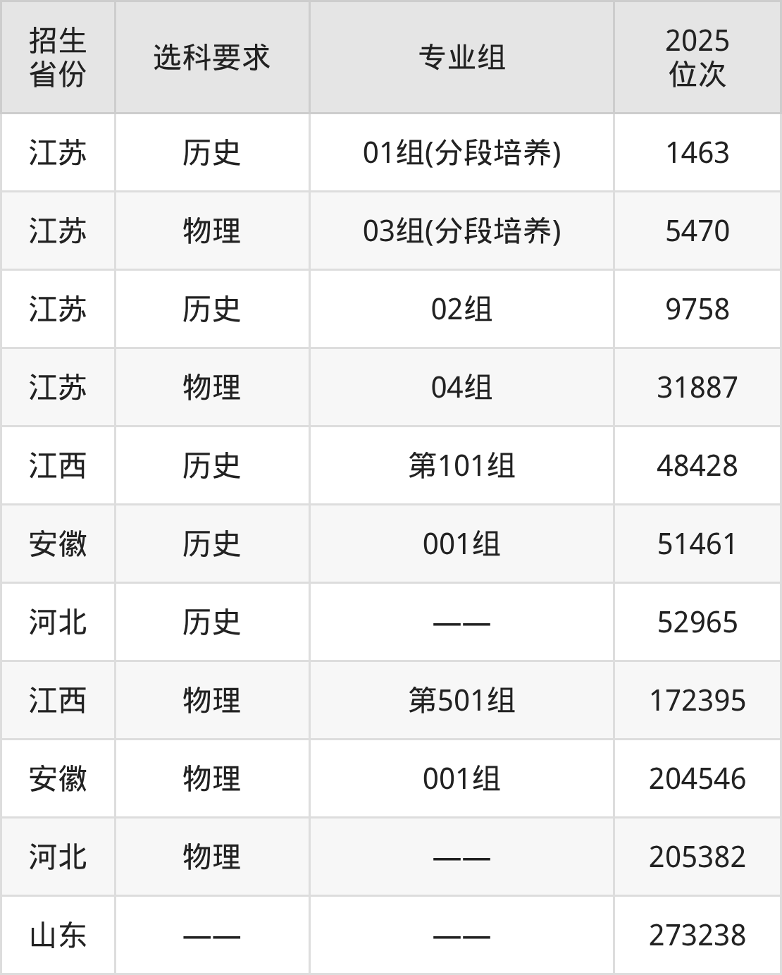 蘇州經(jīng)貿(mào)職業(yè)技術(shù)學(xué)院2025年在全國(guó)各省的位次差異較大,最高位次是1463位(江蘇歷史類)、最低位次是273238位(山東)。各省具體位次請(qǐng)看下圖: