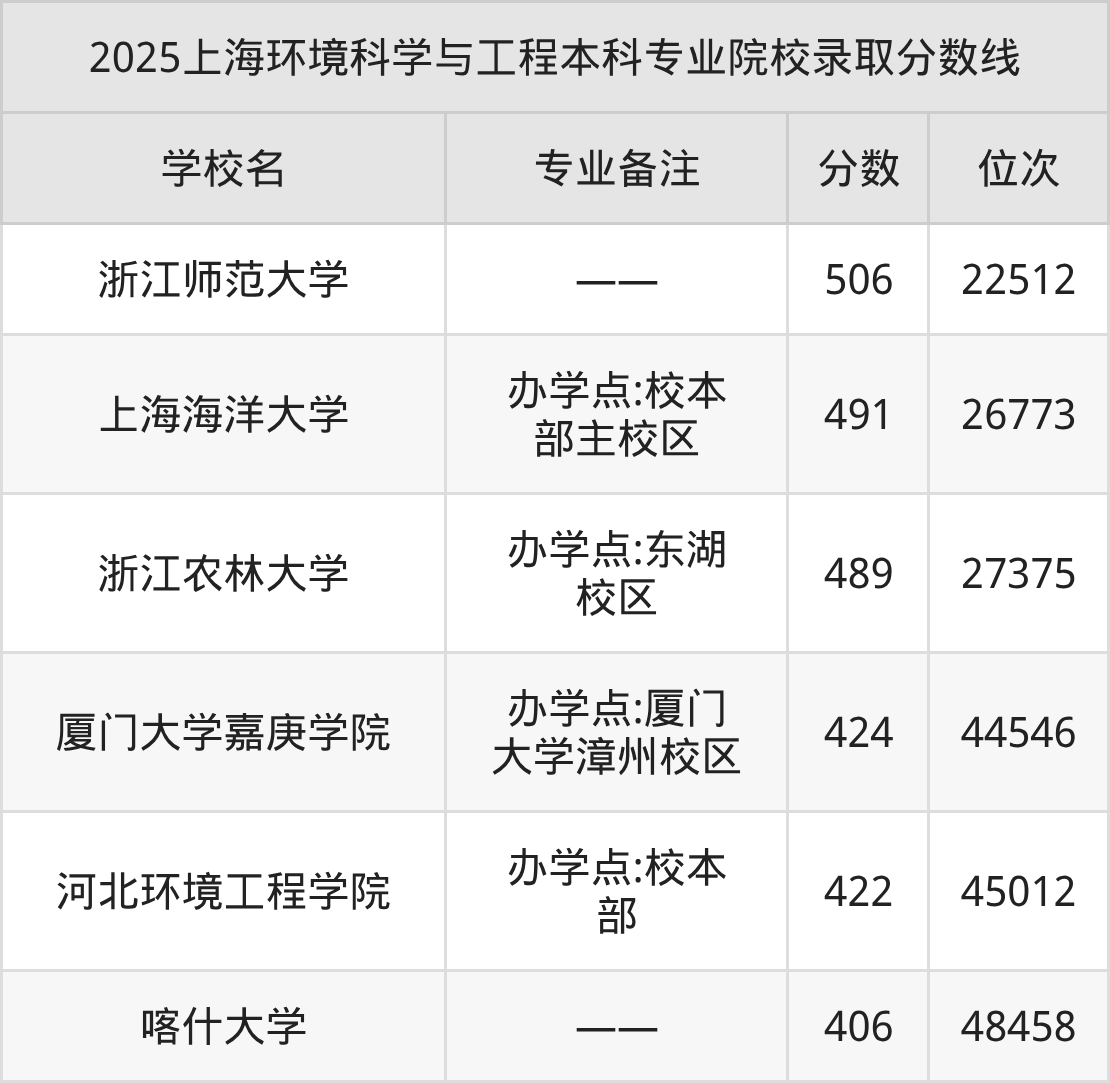 2025年上海環(huán)境科學與工程本科專業(yè)招生院校有6所,分數(shù)最低的是喀什大學(406分、位次48458名),分數(shù)最高的是浙江師范大學(506分、位次22512名)。