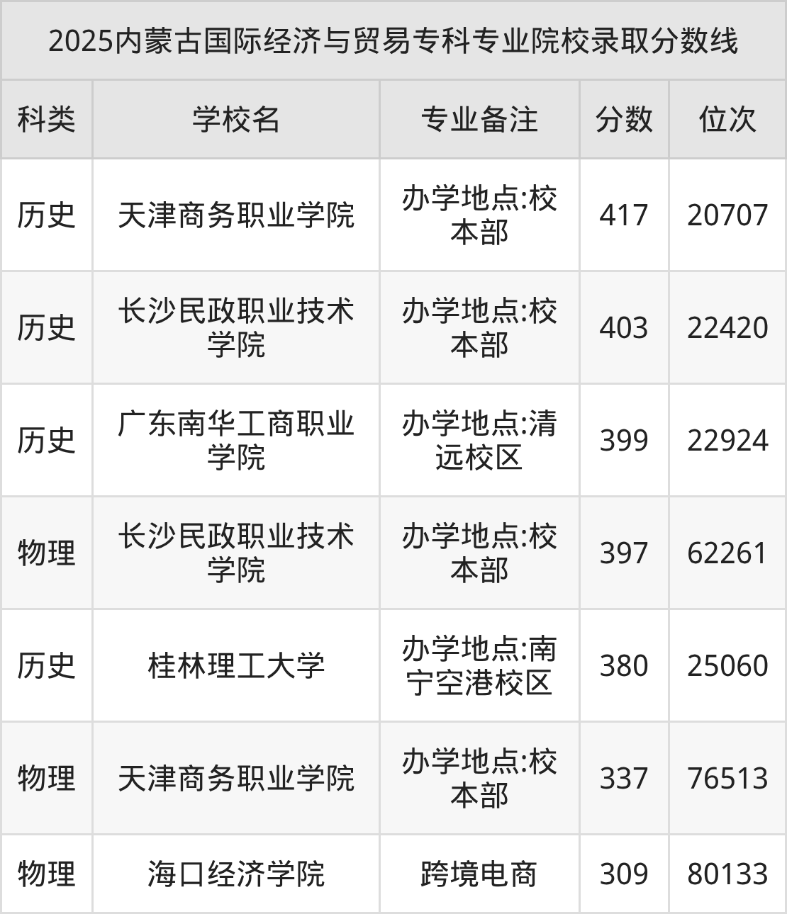 2025年內(nèi)蒙古國際經(jīng)濟與貿(mào)易專科專業(yè)招生院校有5所,分?jǐn)?shù)最低的是??诮?jīng)濟學(xué)院(309分、物理類位次80133名),分?jǐn)?shù)最高的是天津商務(wù)職業(yè)學(xué)院(417分、歷史類位次20707名)。
