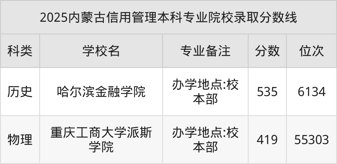 2025年內(nèi)蒙古信用管理分數(shù)線排名前2的大學(xué)名單(本科最難報考):