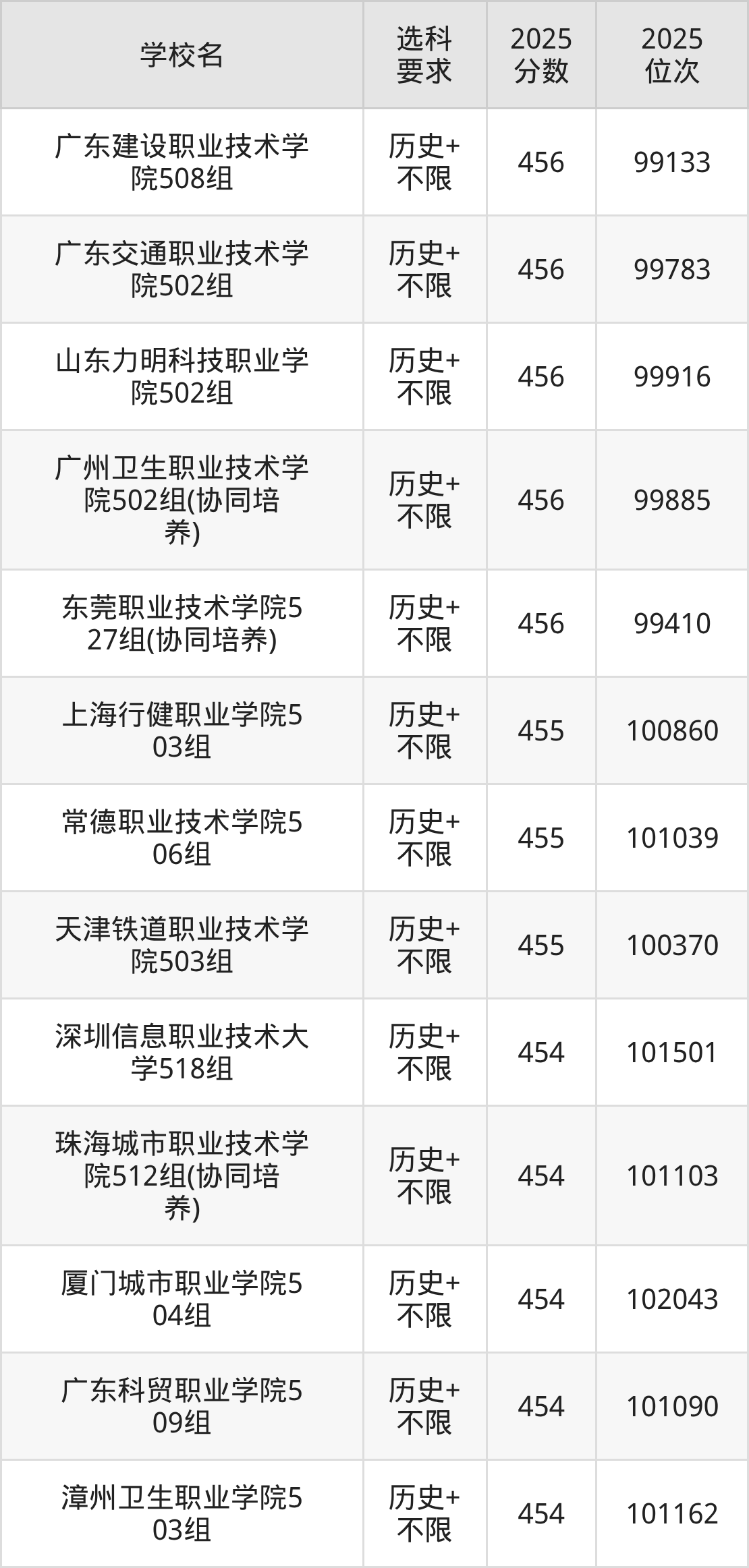 廣東歷政地455分的考生可以上本科大學(xué)(專(zhuān)科專(zhuān)業(yè)),包含12所公辦、1所民辦大學(xué)。其中位于廣東省內(nèi)的大學(xué)有廣東建設(shè)職業(yè)技術(shù)學(xué)院(508組)456分、廣東交通職業(yè)技術(shù)學(xué)院(502組)456分、廣州衛(wèi)生職業(yè)技術(shù)學(xué)院(502組(協(xié)同培養(yǎng)))456分等,位于廣東省外的大學(xué)有山東力明科技職業(yè)學(xué)院(502組)456分、上海行健職業(yè)學(xué)院(503組)455分、常德職業(yè)技術(shù)學(xué)院(506組)455分等。