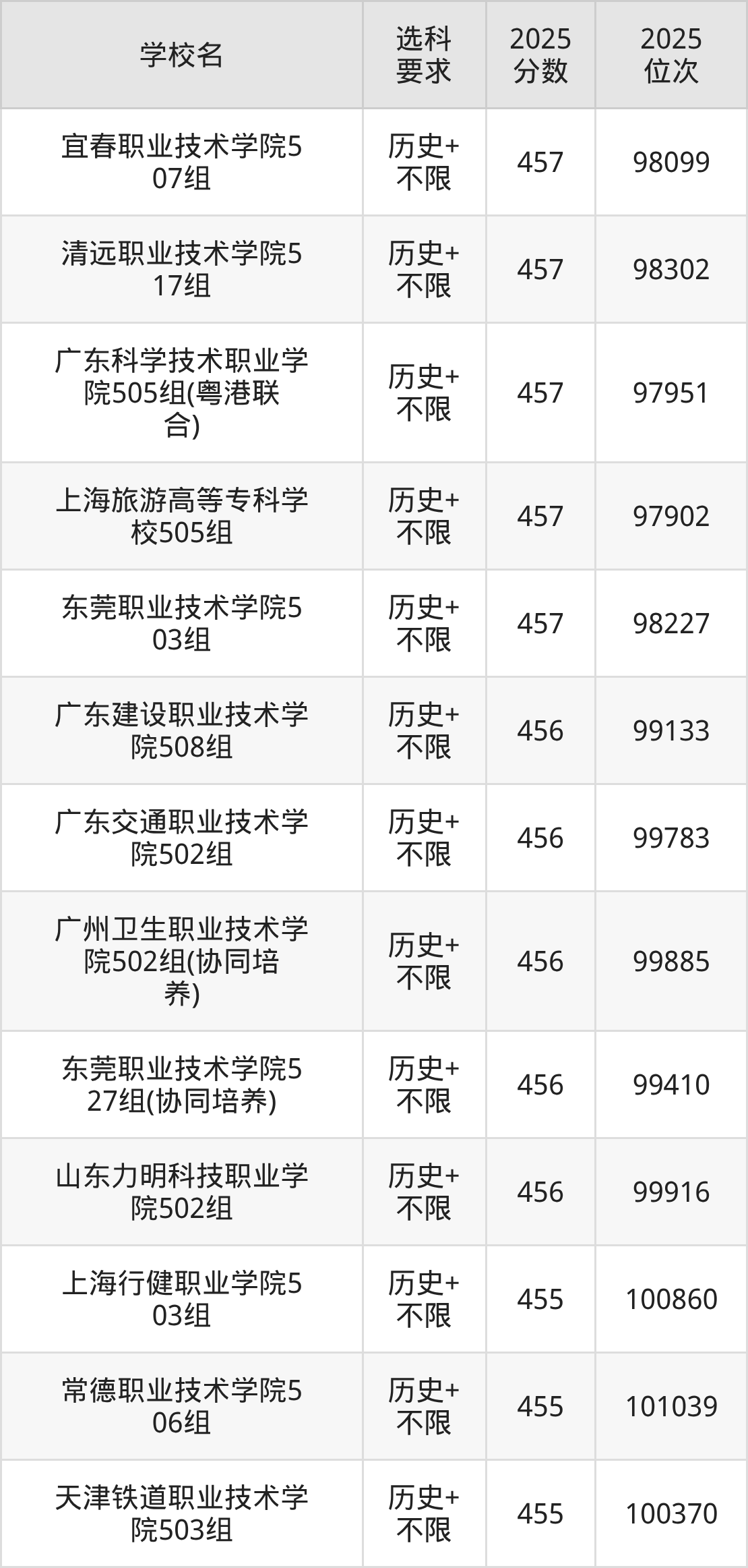廣東歷政地456分的考生可以上??拼髮W(xué)(??茖I(yè)),包含11所公辦、1所民辦大學(xué)。其中位于廣東省內(nèi)的大學(xué)有清遠(yuǎn)職業(yè)技術(shù)學(xué)院(517組)457分、廣東科學(xué)技術(shù)職業(yè)學(xué)院(505組(粵港聯(lián)合))457分、東莞職業(yè)技術(shù)學(xué)院(503組)457分等,位于廣東省外的大學(xué)有宜春職業(yè)技術(shù)學(xué)院(507組)457分、上海旅游高等??茖W(xué)校(505組)457分、山東力明科技職業(yè)學(xué)院(502組)456分等。