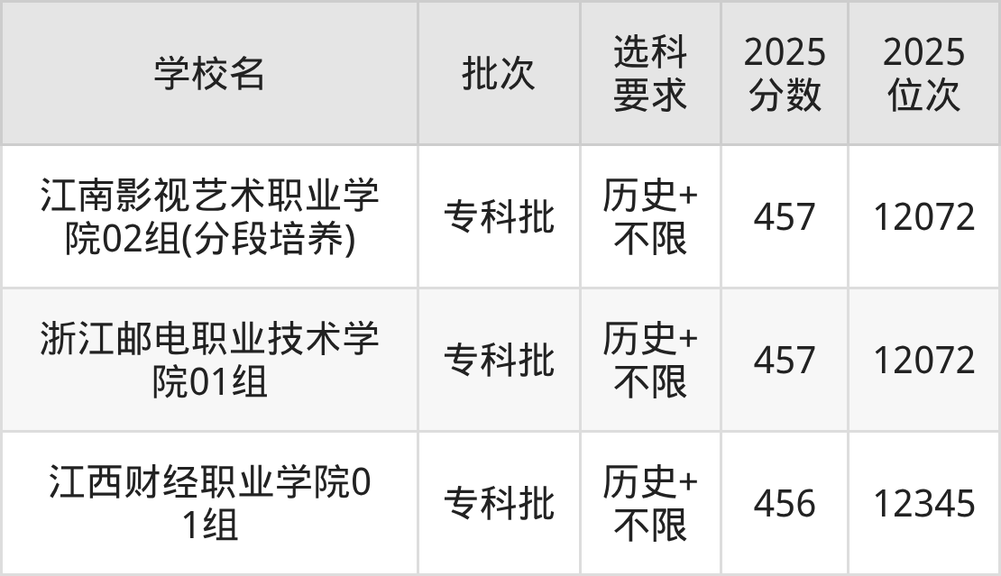 江蘇歷政地456分的考生能上??拼髮W(xué)。其中屬于公辦的有浙江郵電職業(yè)技術(shù)學(xué)院01組(457分)、江西財(cái)經(jīng)職業(yè)學(xué)院01組(456分)。具體名單如下表所示: