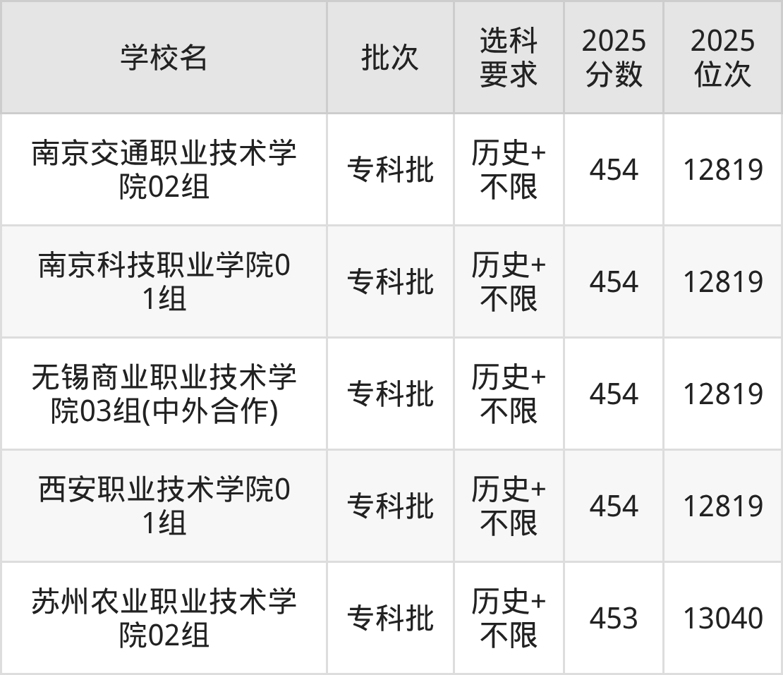 江蘇歷政地454分的考生能上??拼髮W(xué)。其中屬于公辦的有南京交通職業(yè)技術(shù)學(xué)院02組(454分)、蘇州農(nóng)業(yè)職業(yè)技術(shù)學(xué)院02組(453分)、南京科技職業(yè)學(xué)院01組(454分)等。具體名單如下表所示: