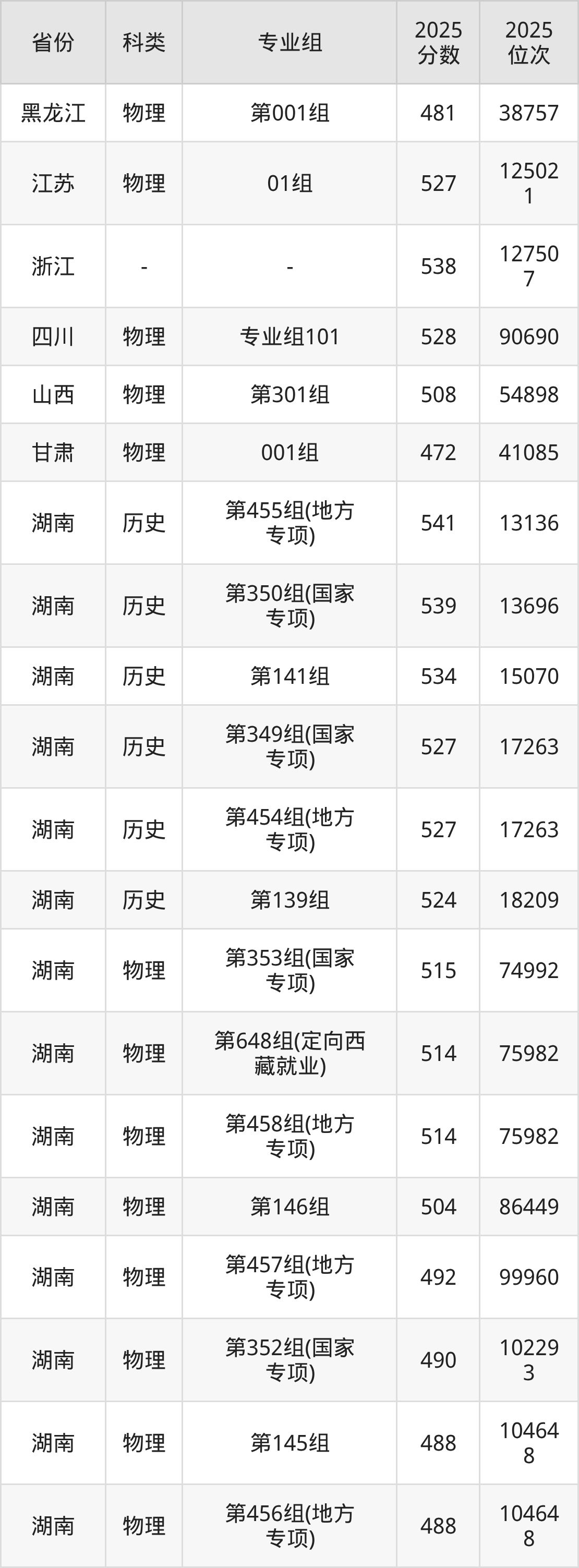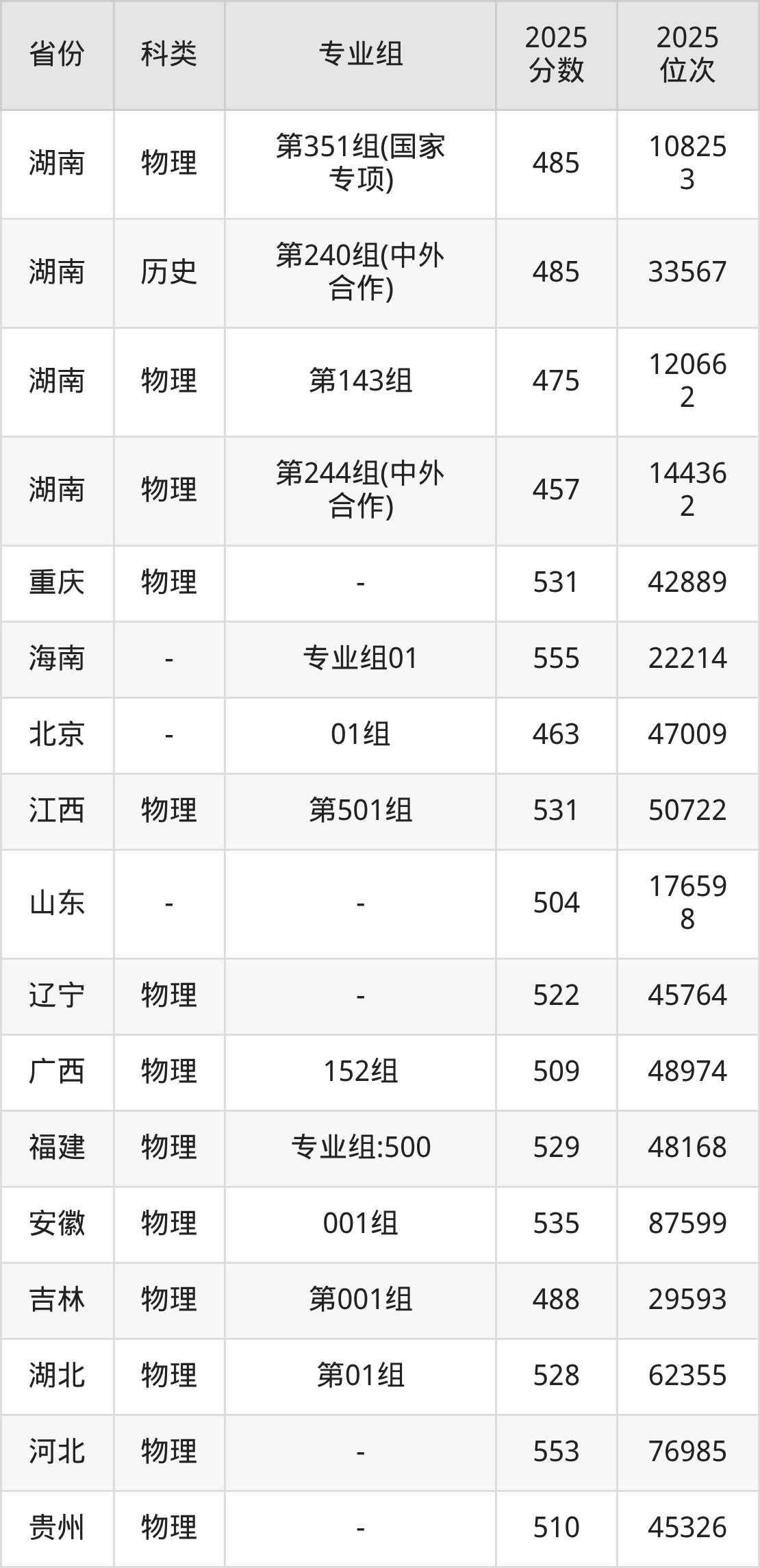 除上述省份外,湖南第一師范學(xué)院2025各省錄取最低分詳情見下:
