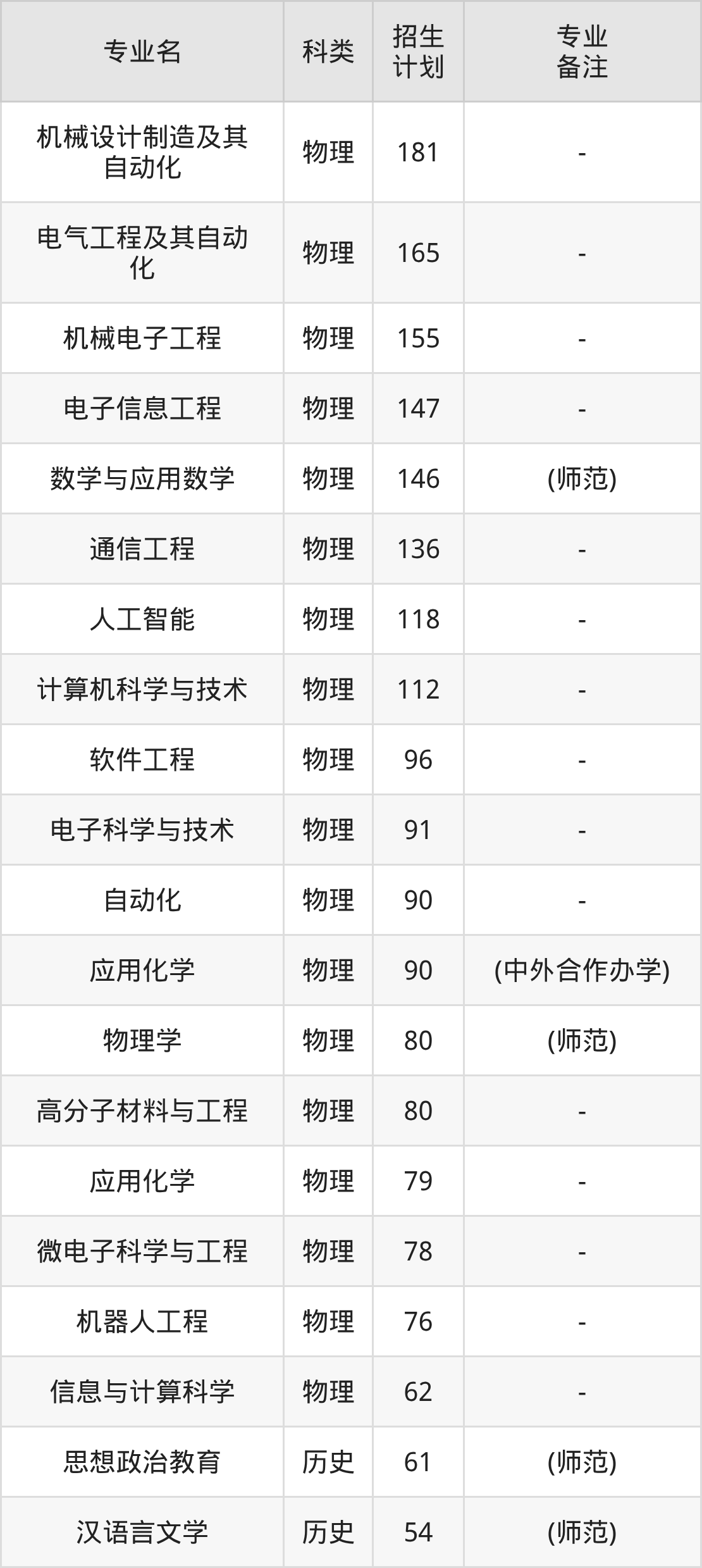 第一名:湖南(2985人),招生人數(shù)最多的專業(yè)是機械設(shè)計制造及其自動化(181人、物理類)。