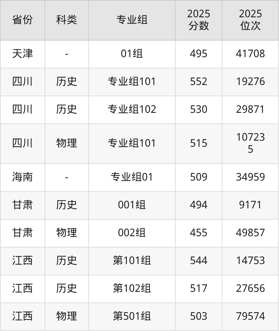 2025湖北文理學(xué)院在各省錄取最低分在386分到552分之間不等,其中分?jǐn)?shù)門檻最低的是吉林,最高的是四川。下面展示湖北文理學(xué)院錄取分?jǐn)?shù)線最低的5個(gè)省份(含最低分專業(yè)組及位次):