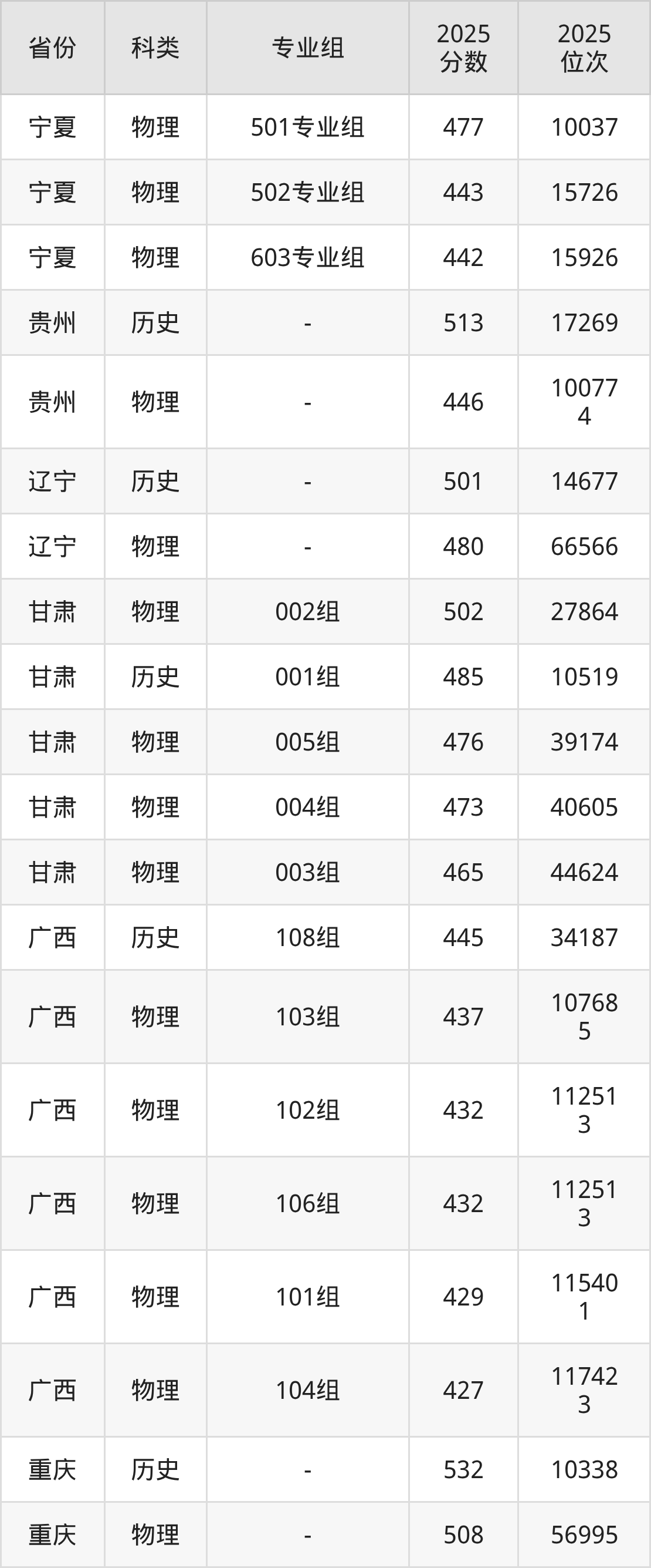 2、廣西:最低分427分,對應(yīng)最低分專業(yè)組為物理類104組,位次117423名;
